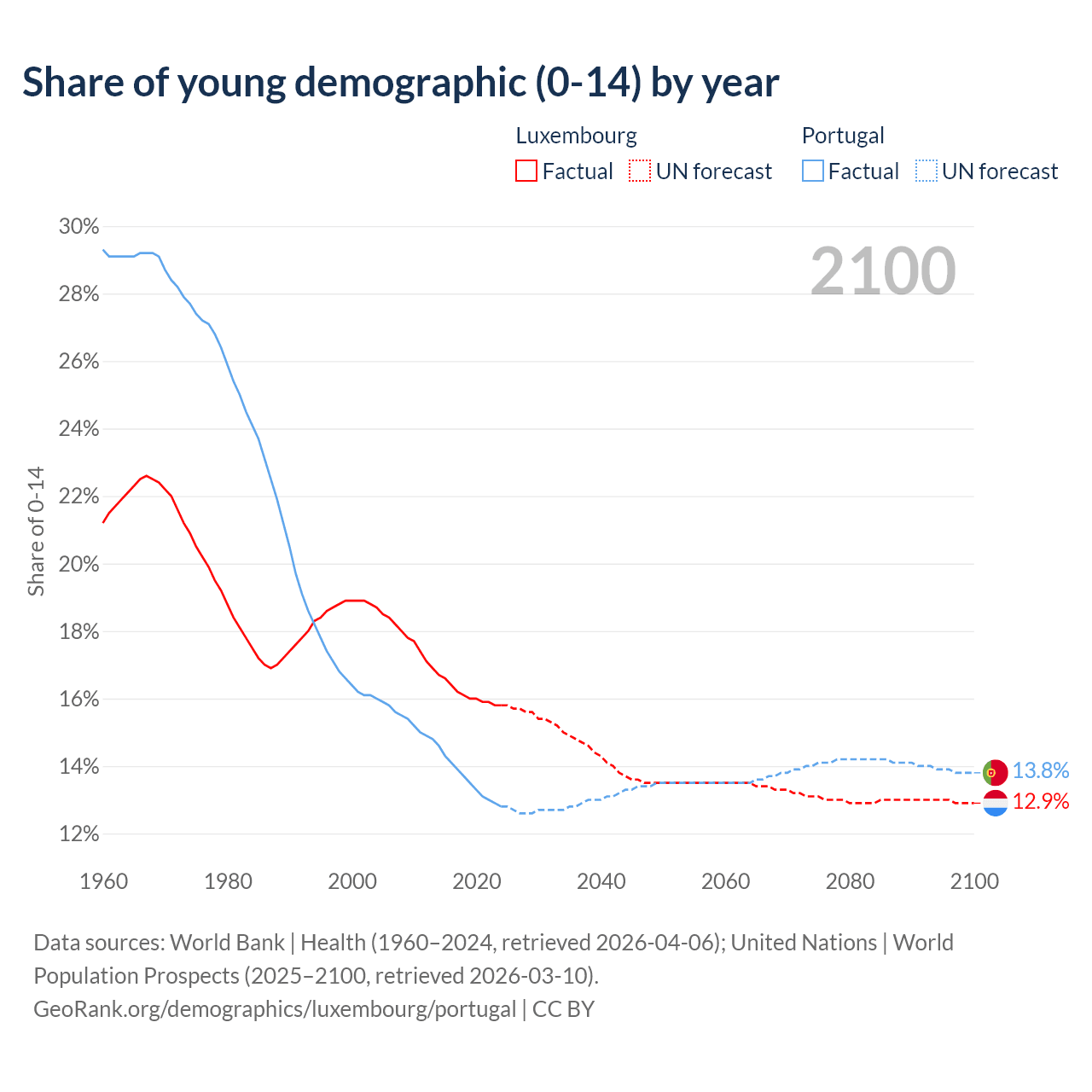 - The share of young demographic (0-15 years old) in Luxembourg is 15.8% vs 12.8% in Portugal.