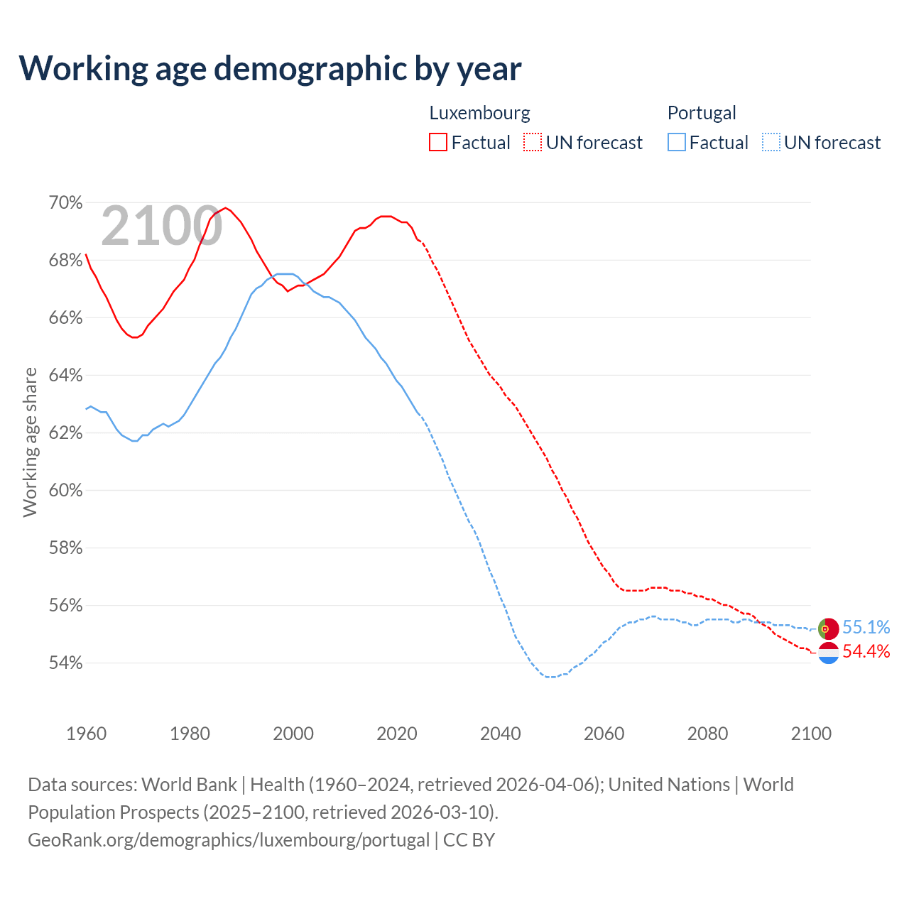 Median age Luxembourg vs Portugal, 1960-2100