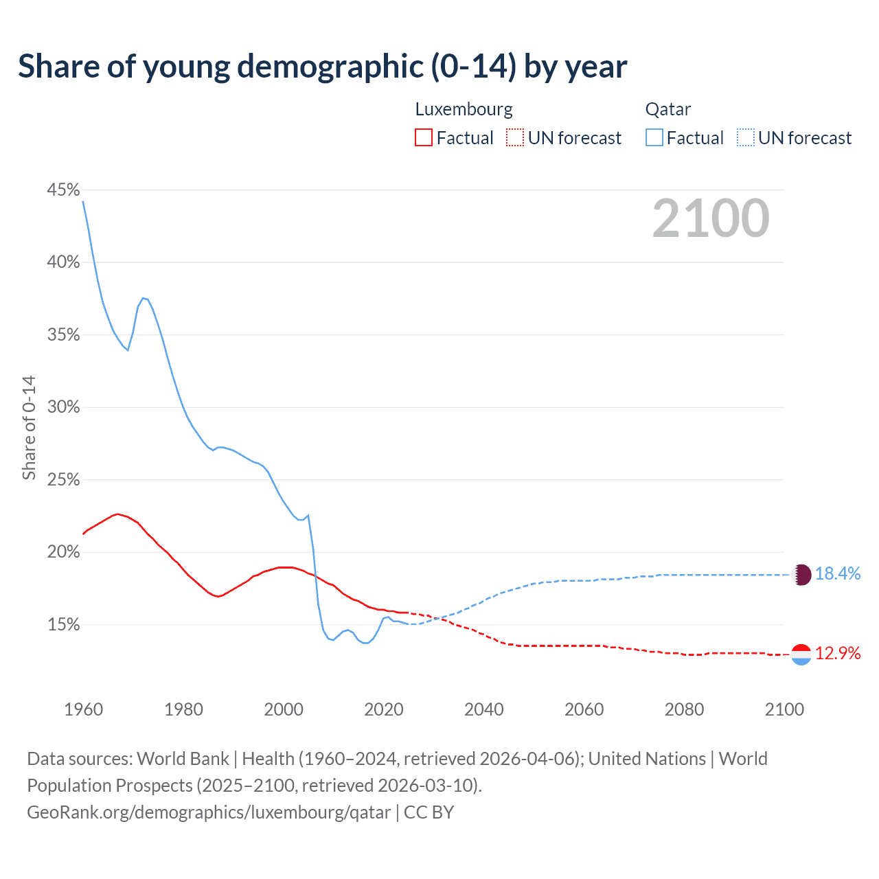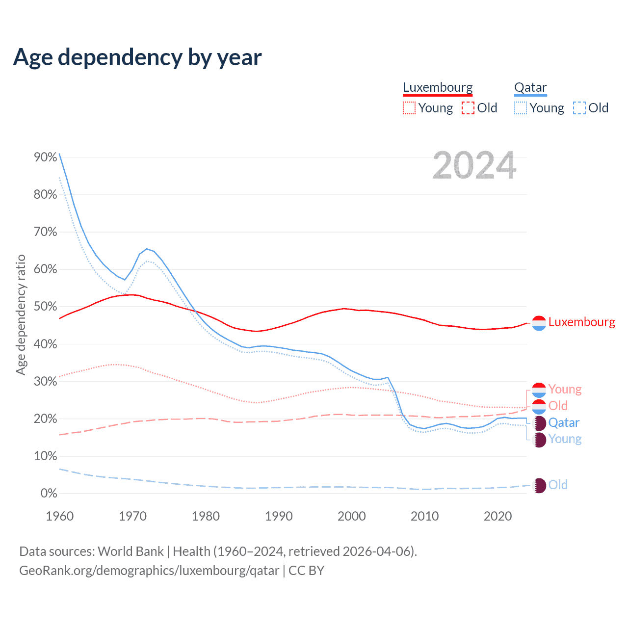 - The share of young demographic (0-15 years old) in Luxembourg is 15.8% vs 15.1% in Qatar.