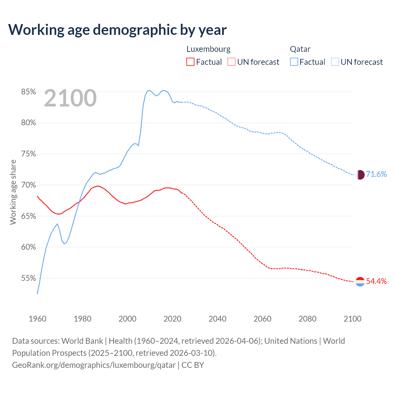 Median age Luxembourg vs Qatar, 1960-2100