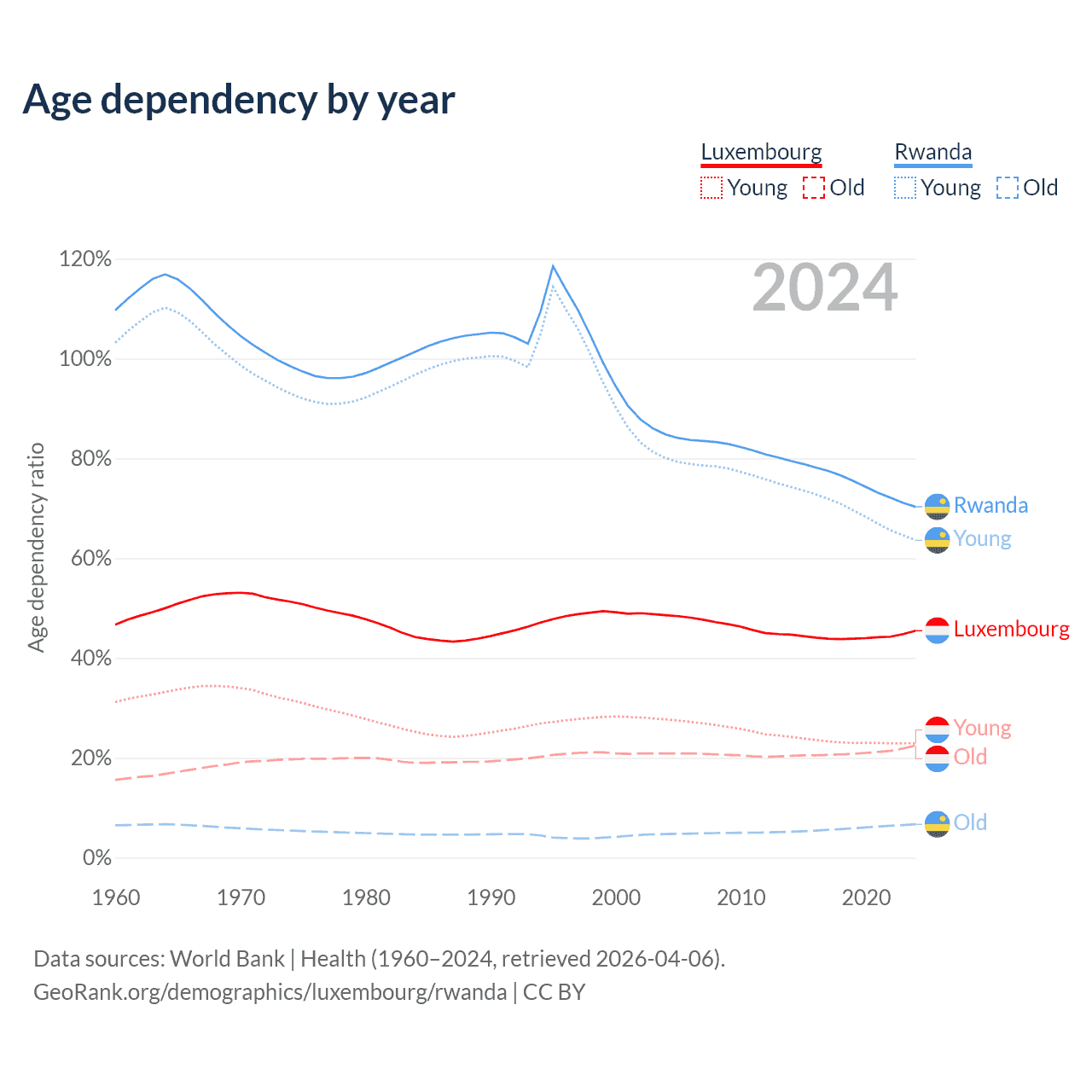 - The share of old-age demographic (65+) in Luxembourg is 15.5% vs 3.93% in Rwanda.