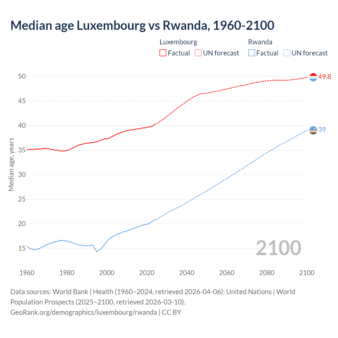 Median age Luxembourg vs Rwanda, 1960-2100