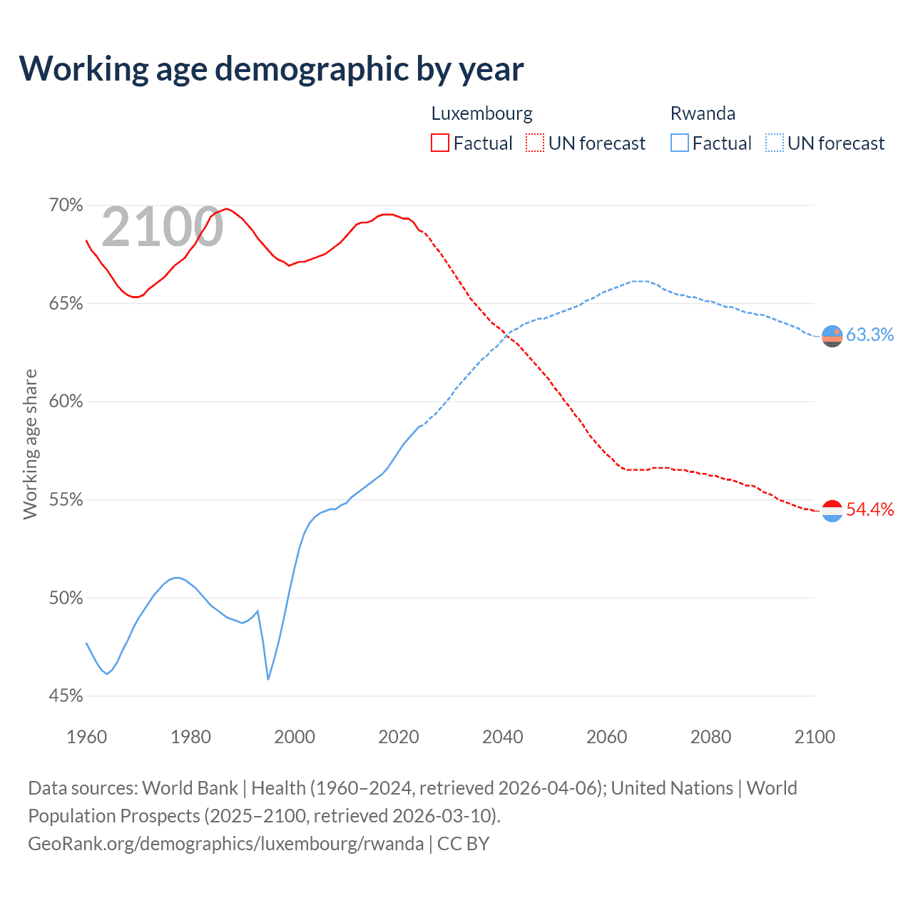 - Luxembourg has 477K working age adults (aged 15-64) vs 8.79M in Rwanda.