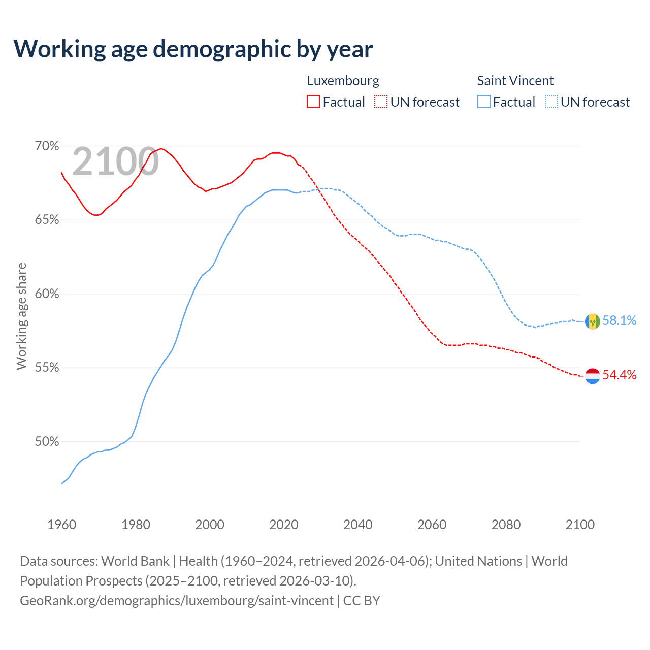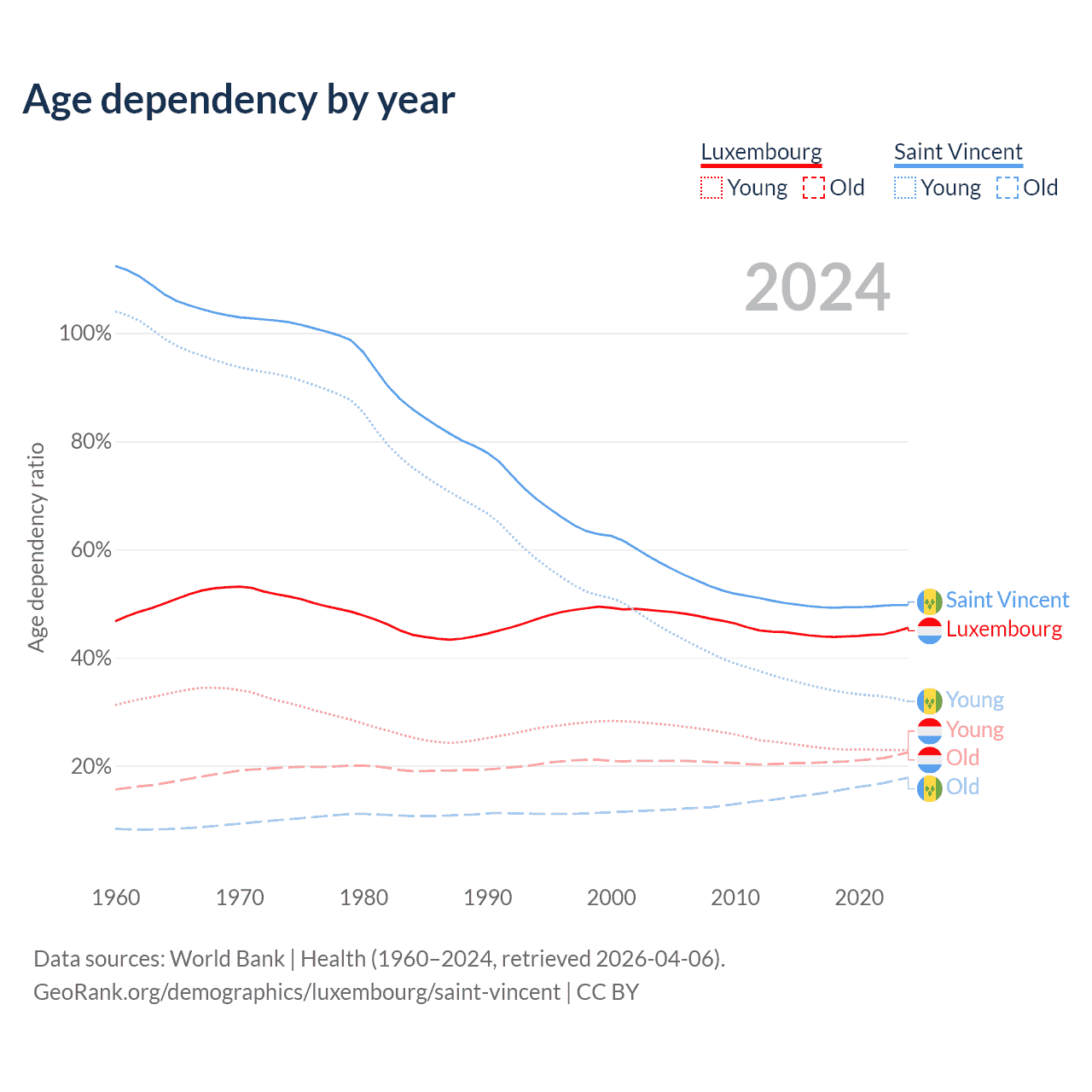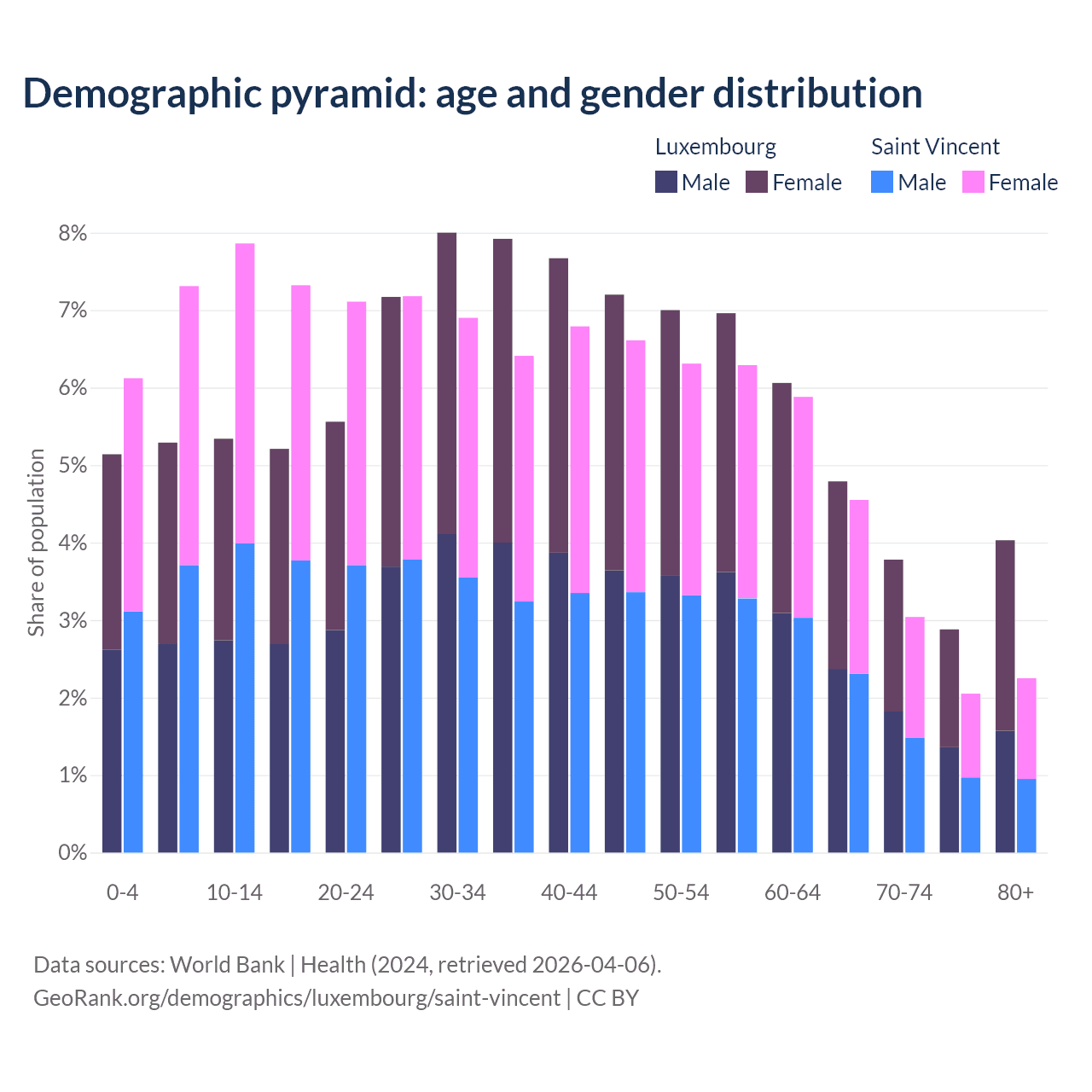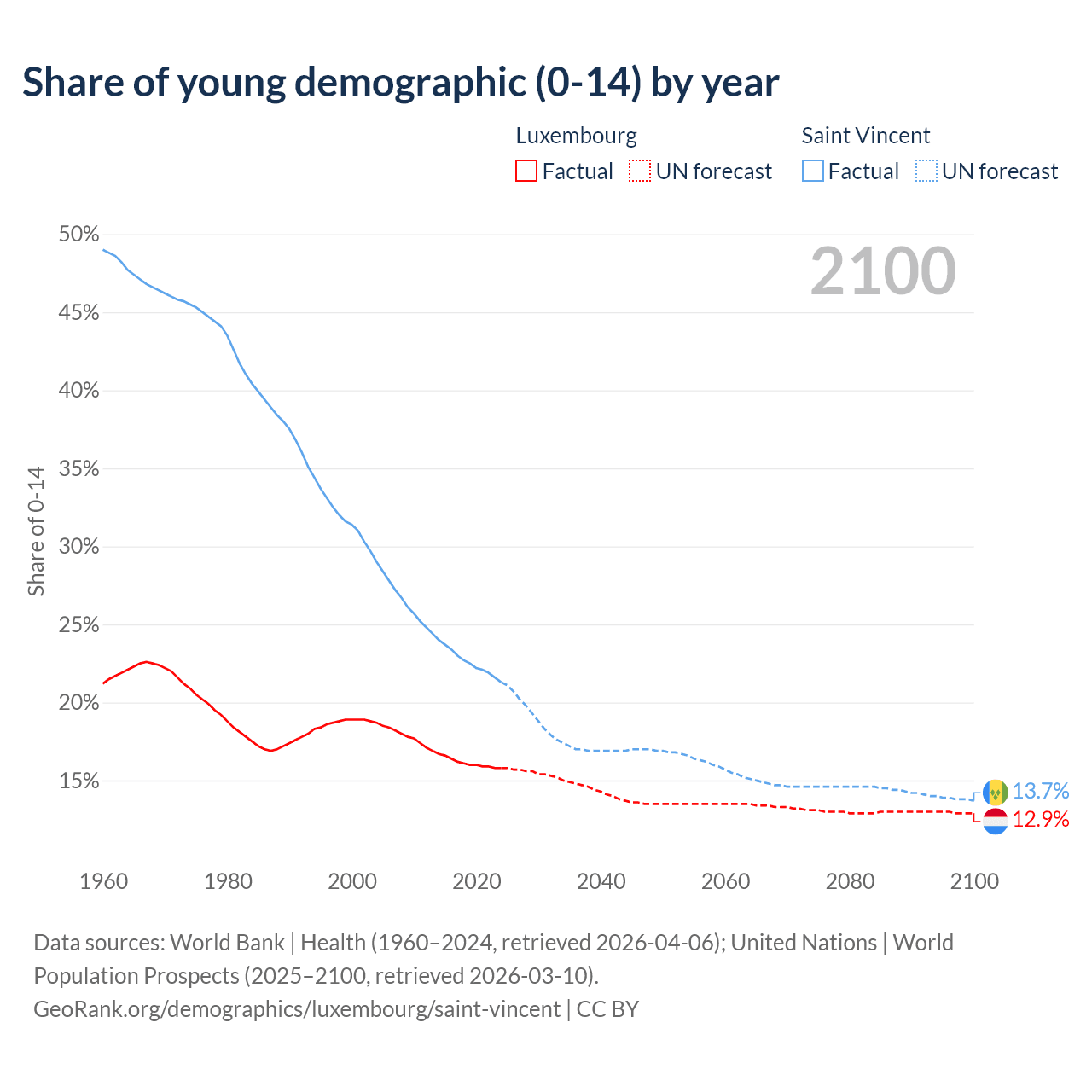- The share of young demographic (0-15 years old) in Luxembourg is 15.8% vs 21.3% in Saint Vincent.