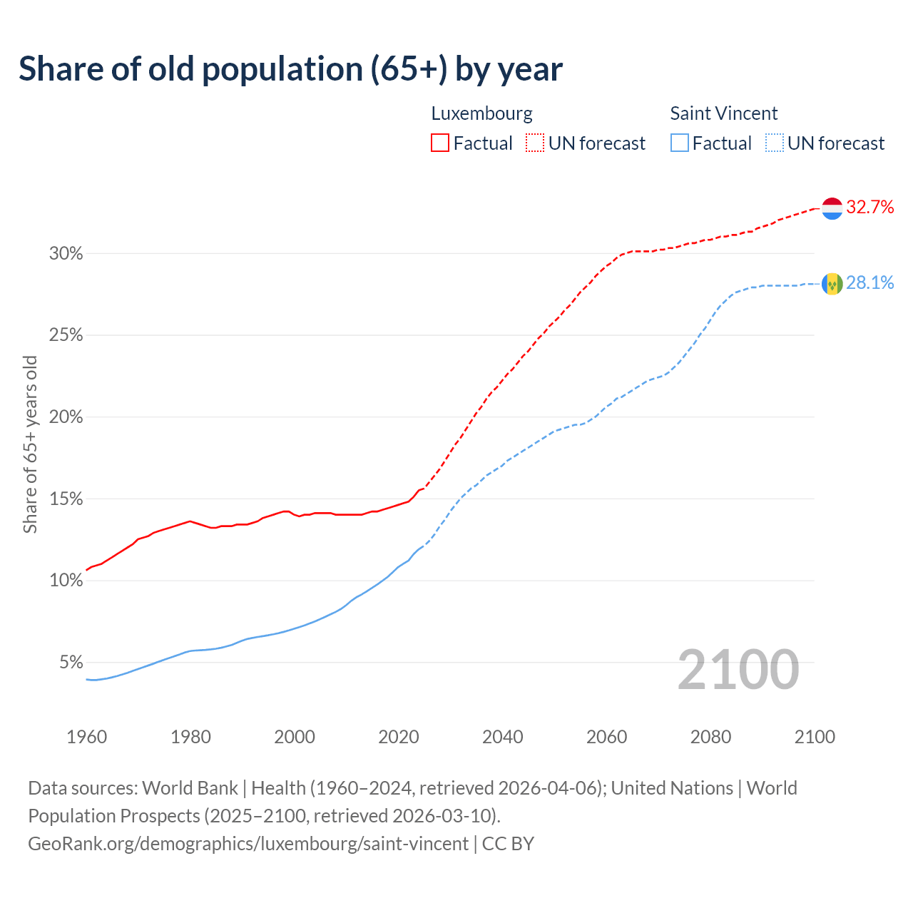 The share of older people aged 65 and over is 15.5% in Luxembourg and 11.9% in Saint Vincent. Life expectancy in Luxembourg compared to Saint Vincent .