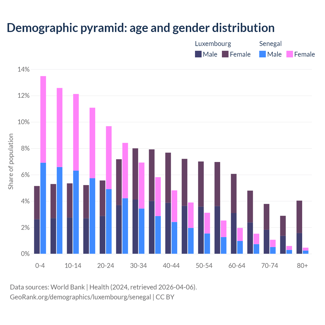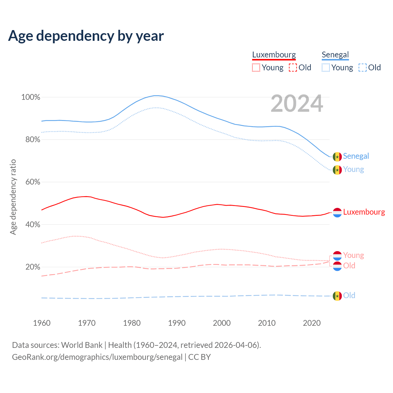 - The share of old-age demographic (65+) in Luxembourg is 15.5% vs 3.62% in Senegal.