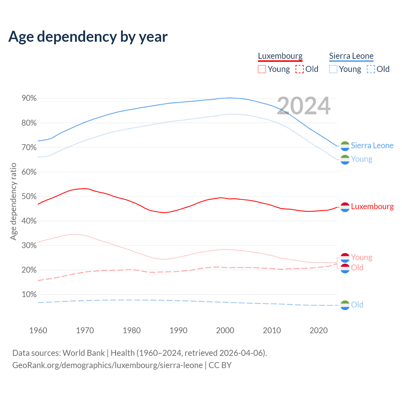 - Luxembourg is ranked 46/196 by median age (oldest to youngest) vs 161/196 for Sierra Leone.