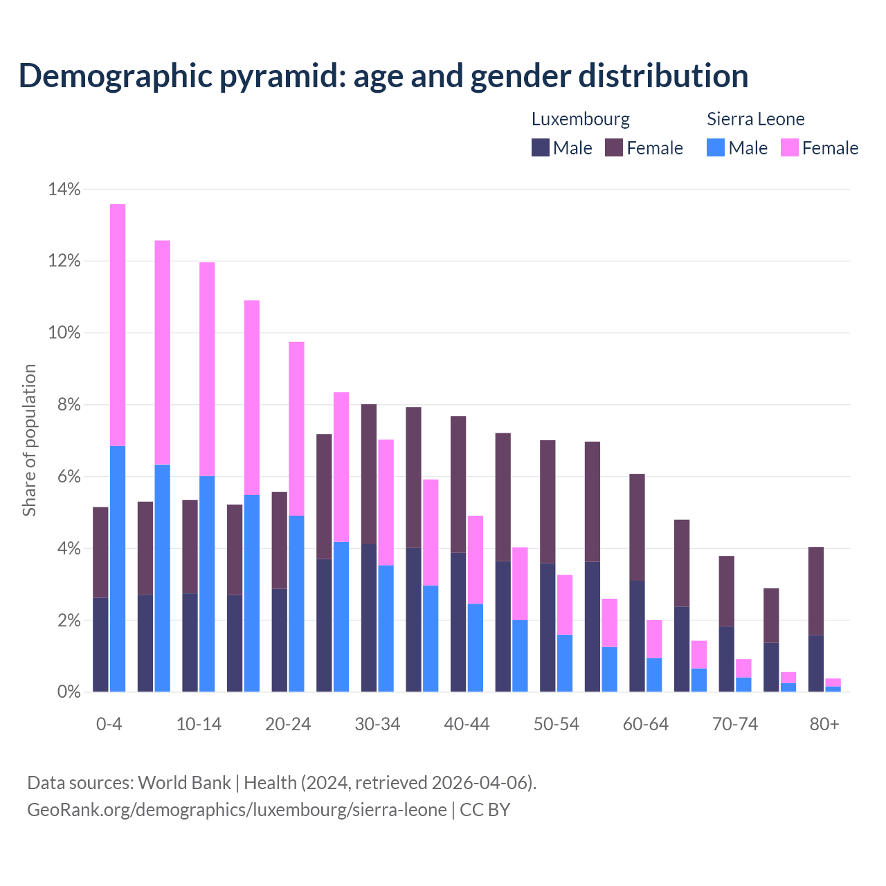 - As of 2026, the population of Luxembourg is 694K vs 9.05M in Sierra Leone - 13 times difference.