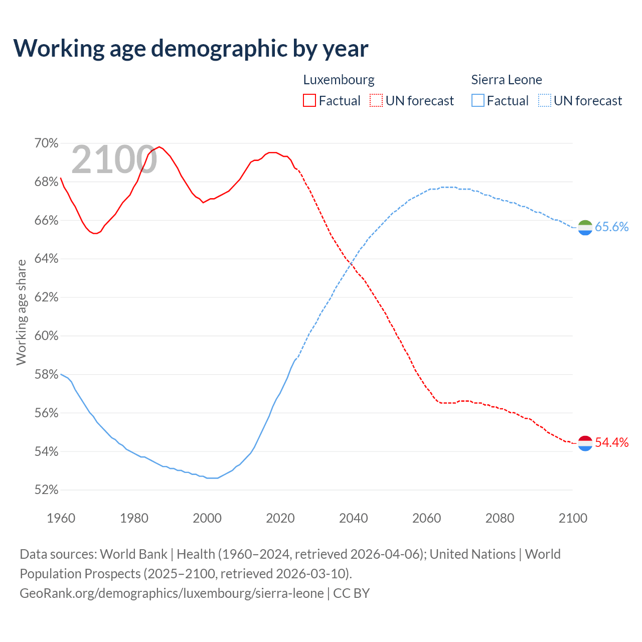 - Luxembourg has 477K working age adults (aged 15-64) vs 5.31M in Sierra Leone.