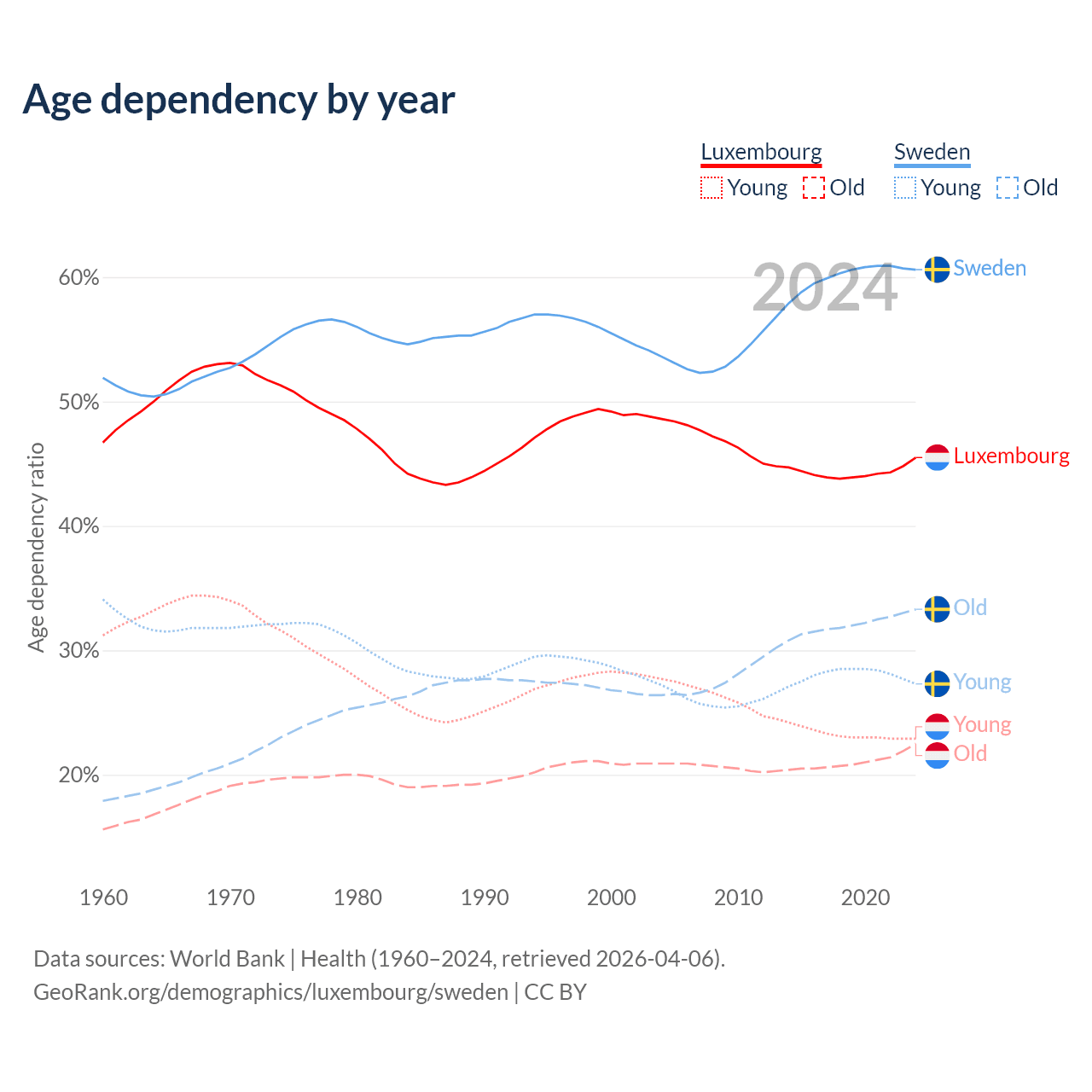 - Luxembourg is ranked 46/196 by median age (oldest to youngest) vs 39/196 for Sweden.