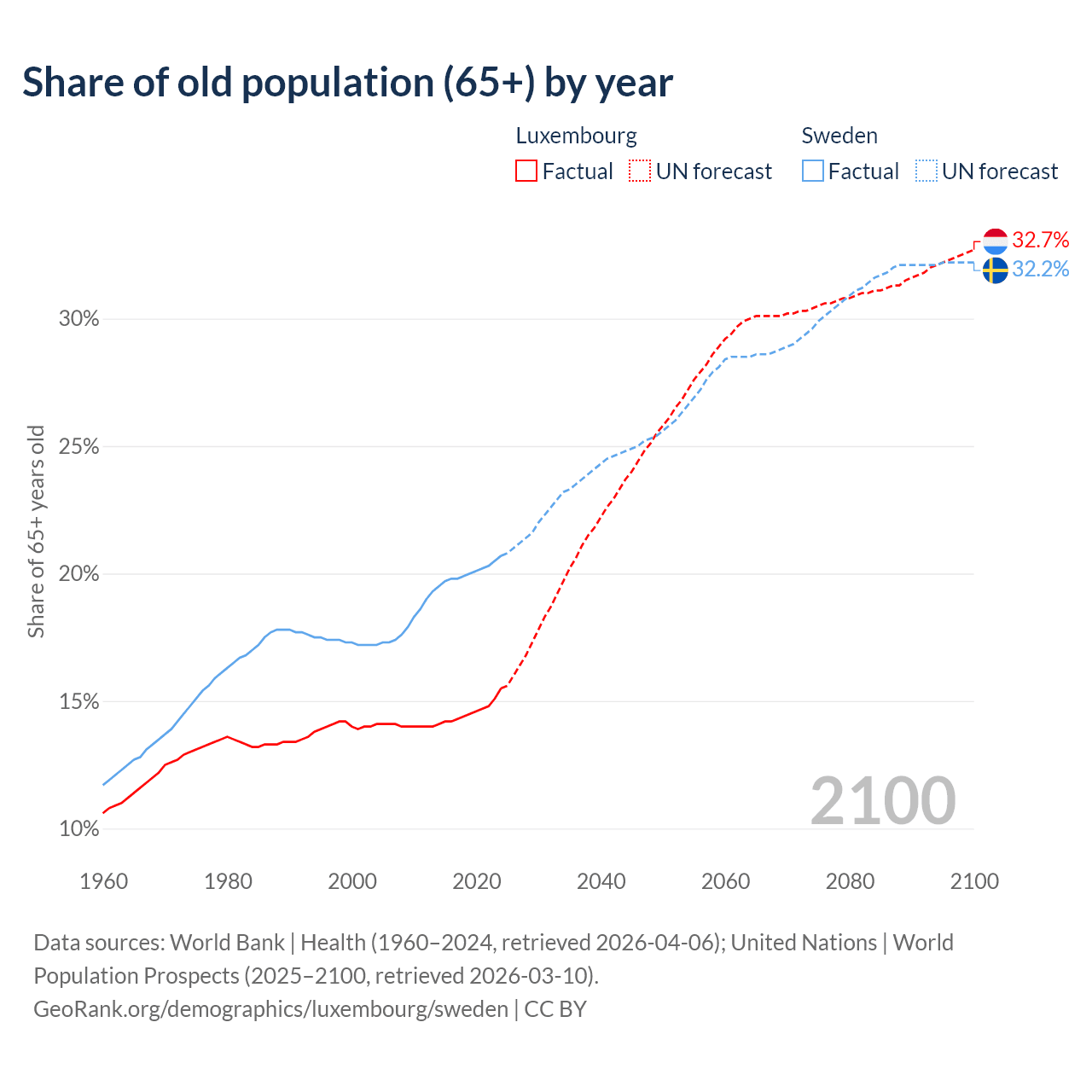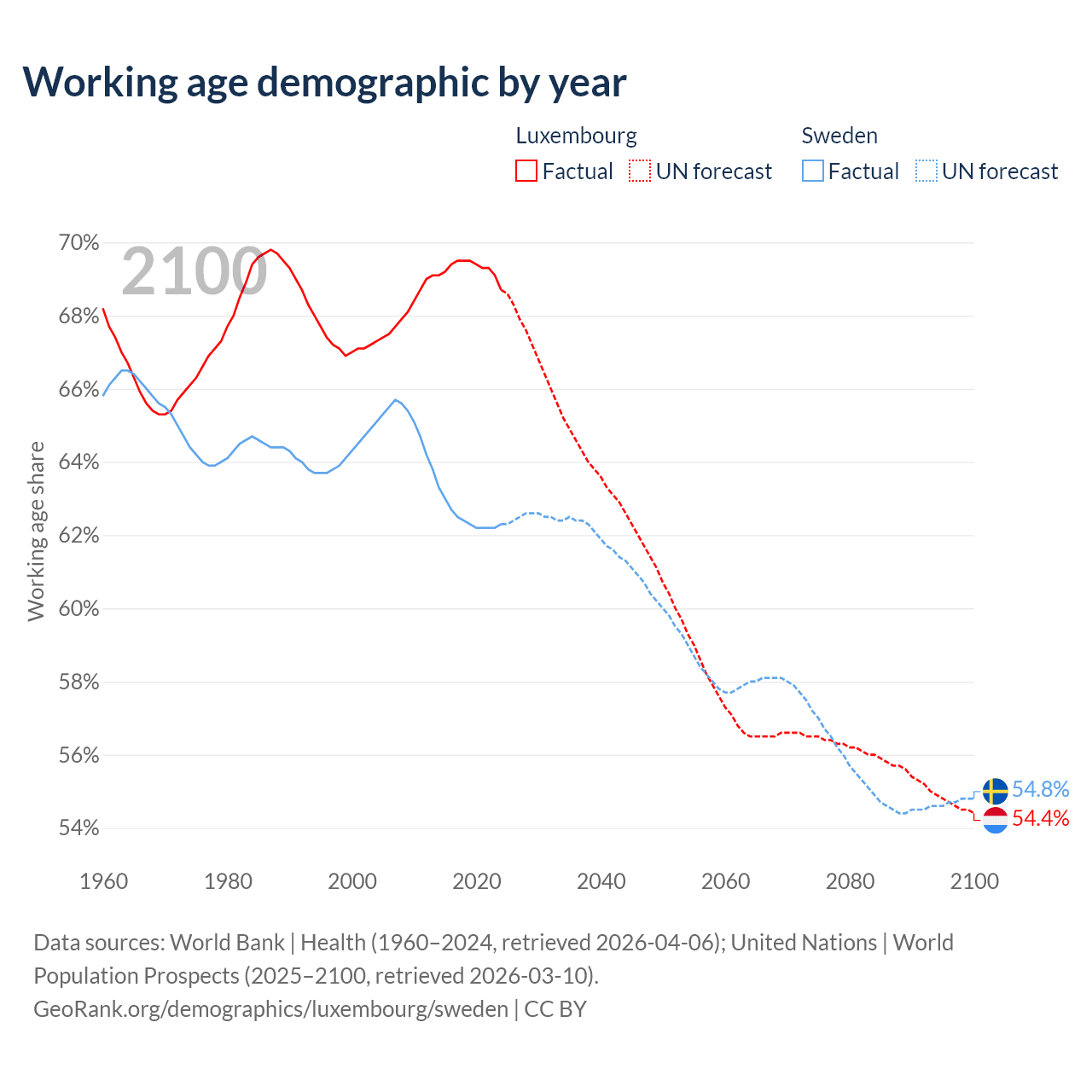 Median age Luxembourg vs Sweden, 1960-2100
