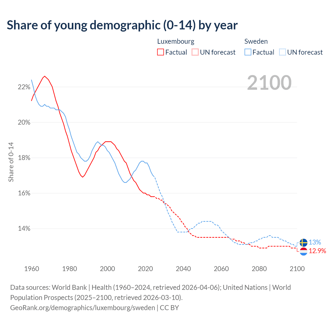 - The share of young demographic (0-15 years old) in Luxembourg is 15.8% vs 17% in Sweden.