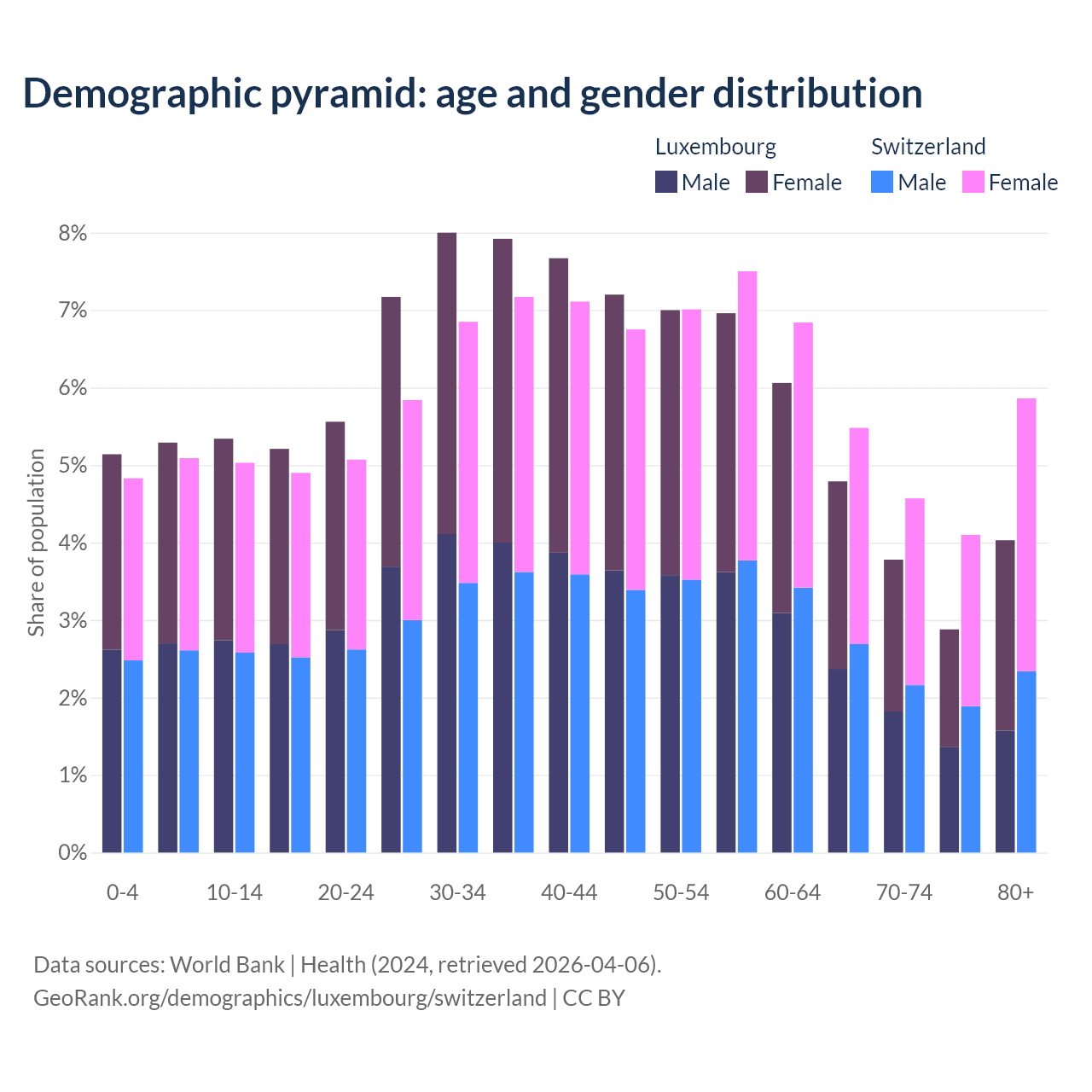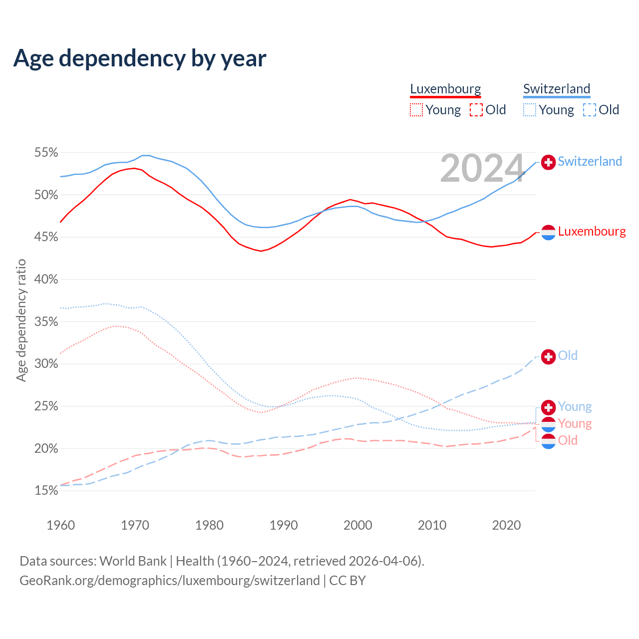The share of older people aged 65 and over is 15.5% in Luxembourg and 20% in Switzerland. Life expectancy in Luxembourg compared to Switzerland .