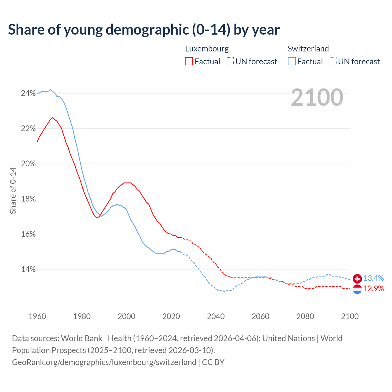 - The share of young demographic (0-15 years old) in Luxembourg is 15.8% vs 15% in Switzerland.