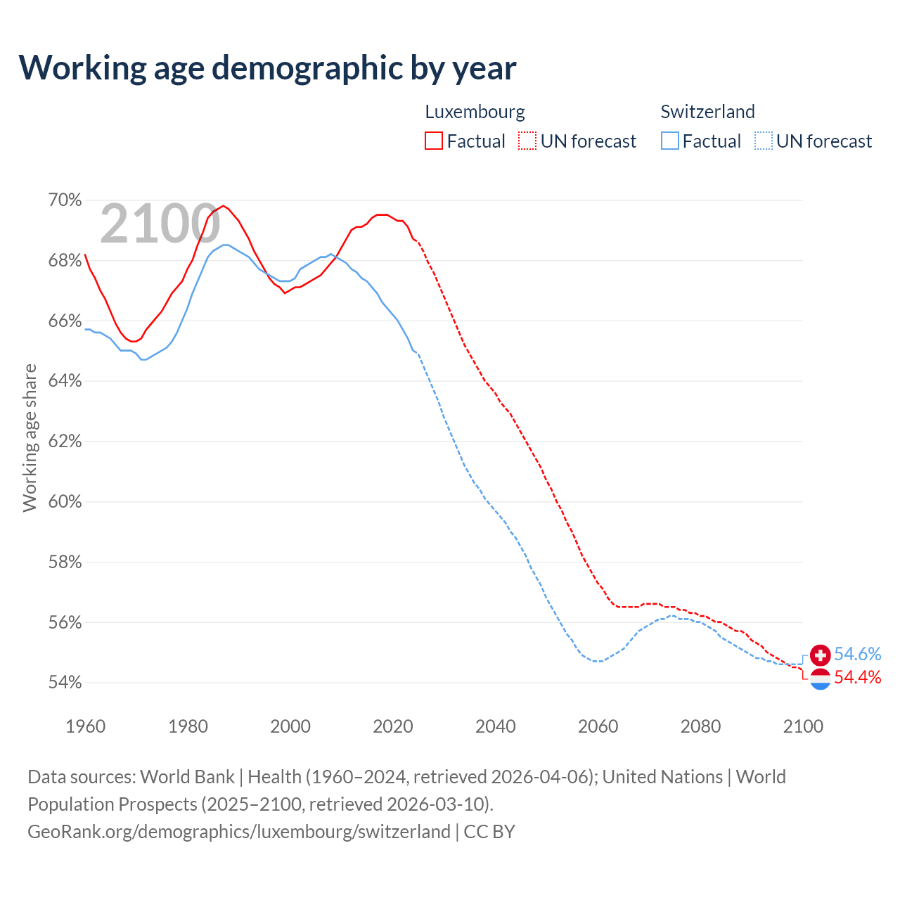 Median age Luxembourg vs Switzerland, 1960-2100