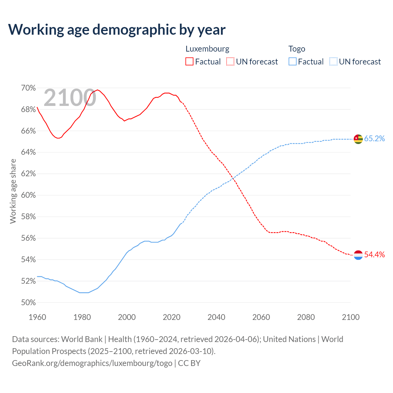 - Luxembourg has 477K working age adults (aged 15-64) vs 5.72M in Togo.