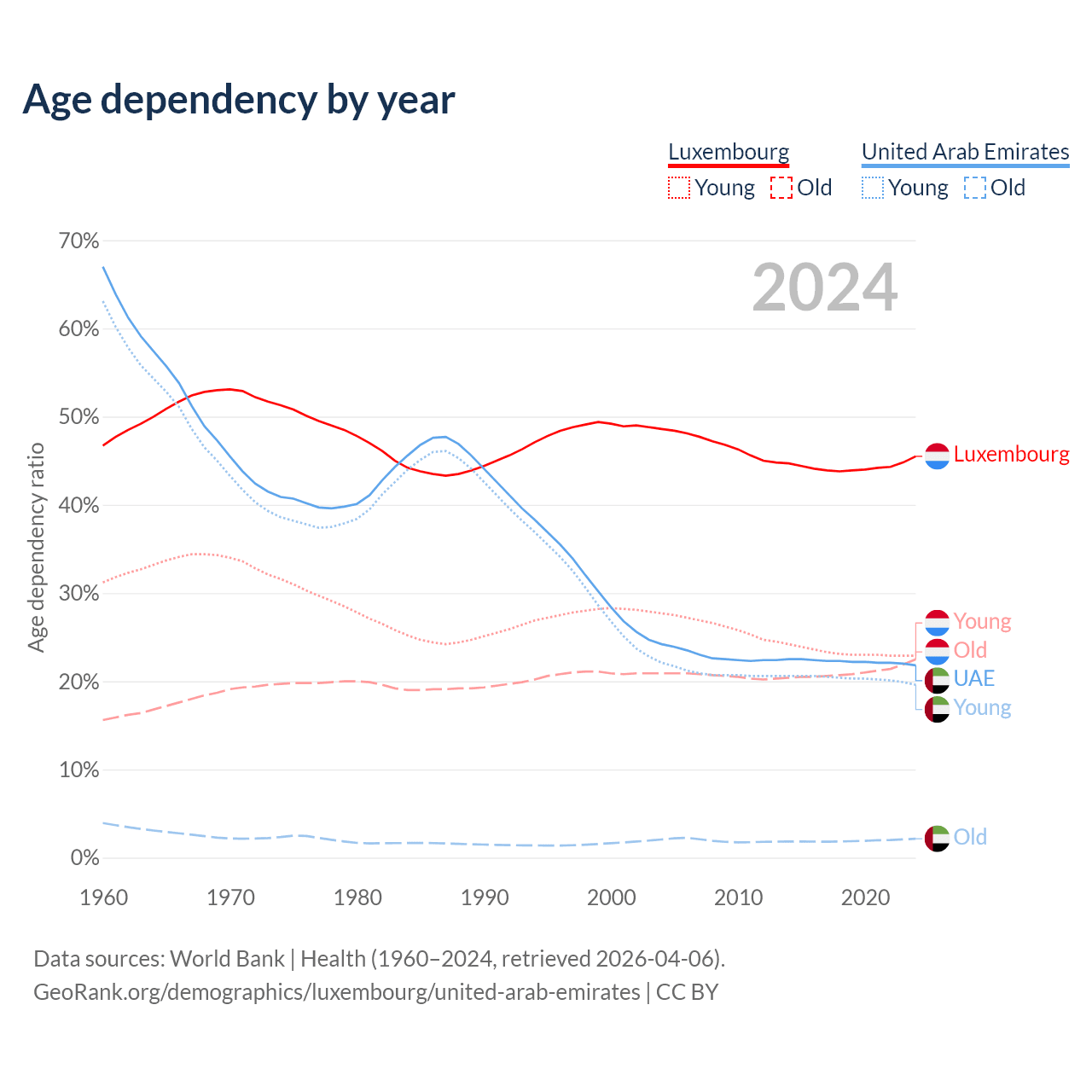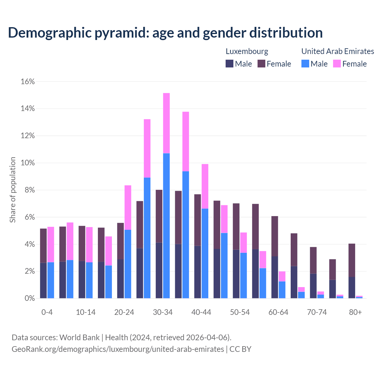 - Luxembourg is ranked 46/196 by median age (oldest to youngest) vs 91/196 for the United Arab Emirates.
