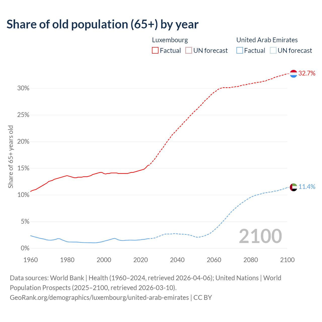 The share of older people aged 65 and over is 15.5% in Luxembourg and 1.77% in the United Arab Emirates. Life expectancy in Luxembourg compared to the United Arab Emirates .