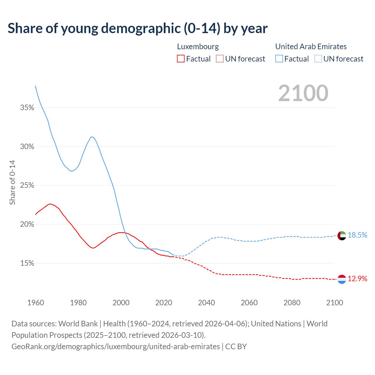 - The share of young demographic (0-15 years old) in Luxembourg is 15.8% vs 16.1% in the United Arab Emirates.