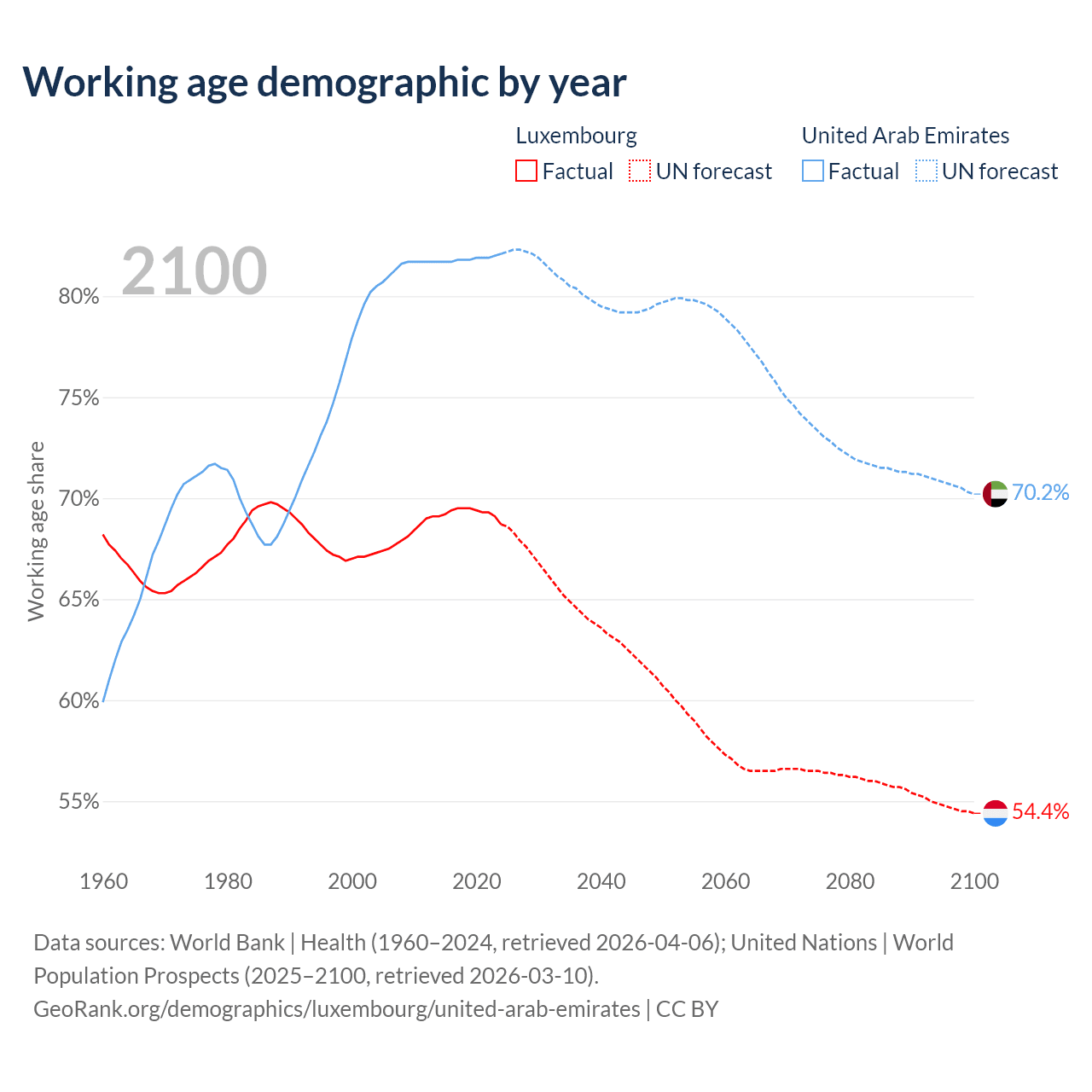 - Luxembourg has 477K working age adults (aged 15-64) vs 9.6M in the United Arab Emirates.