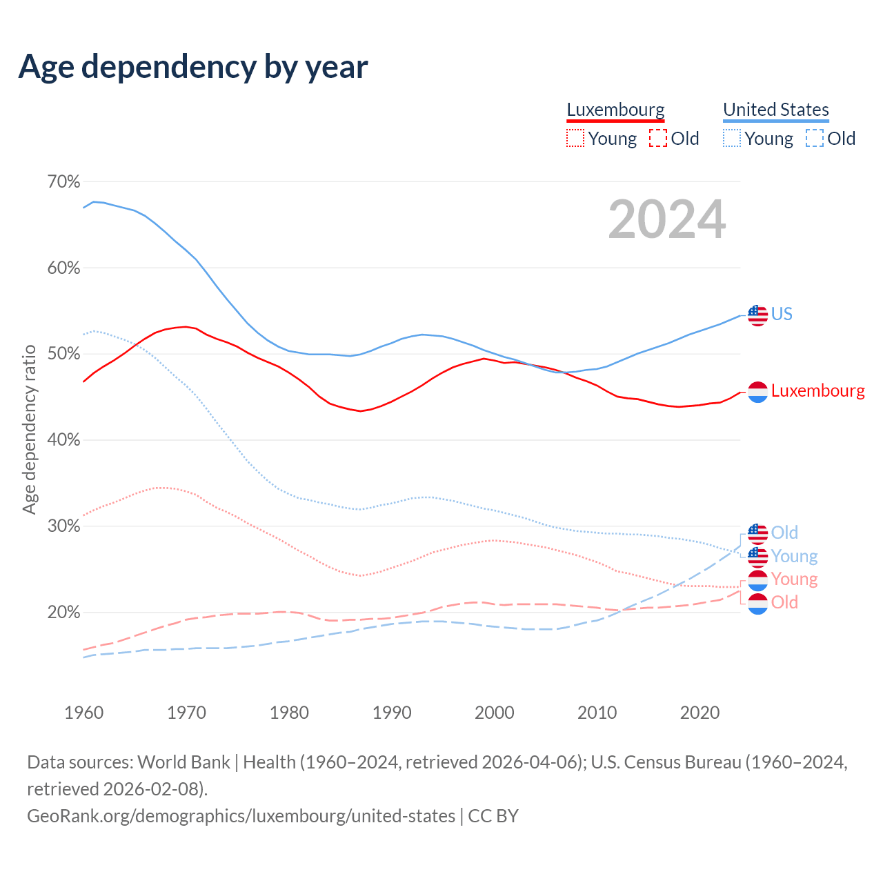 - Luxembourg is ranked 46/196 by median age (oldest to youngest) vs 50/196 for the United States.