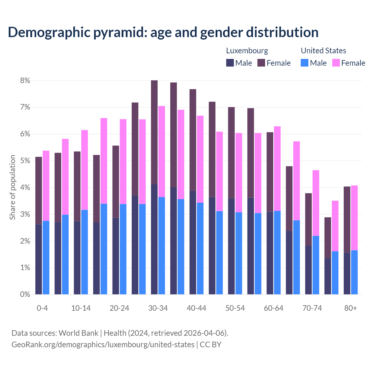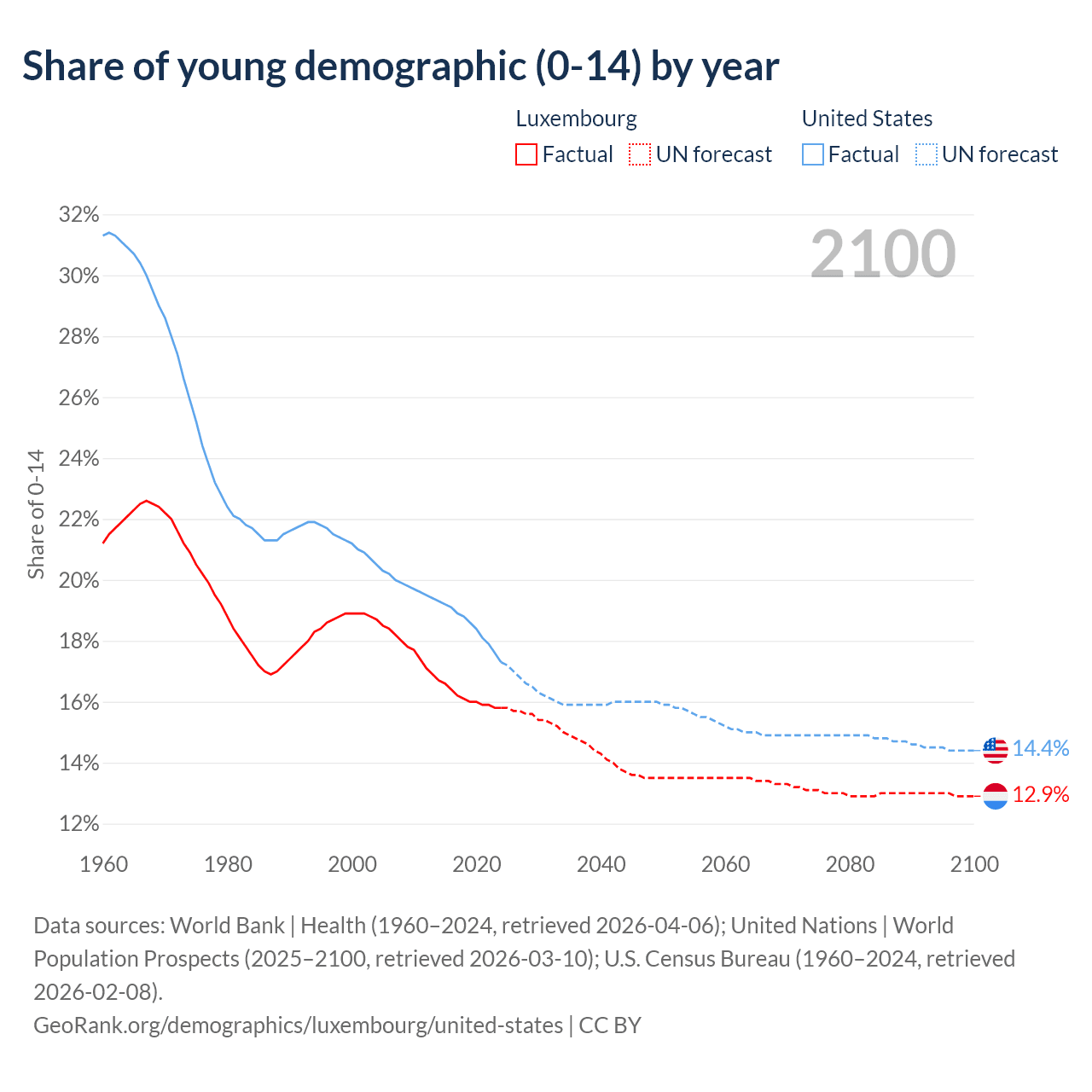 - The share of young demographic (0-15 years old) in Luxembourg is 15.8% vs 17.3% in the United States.