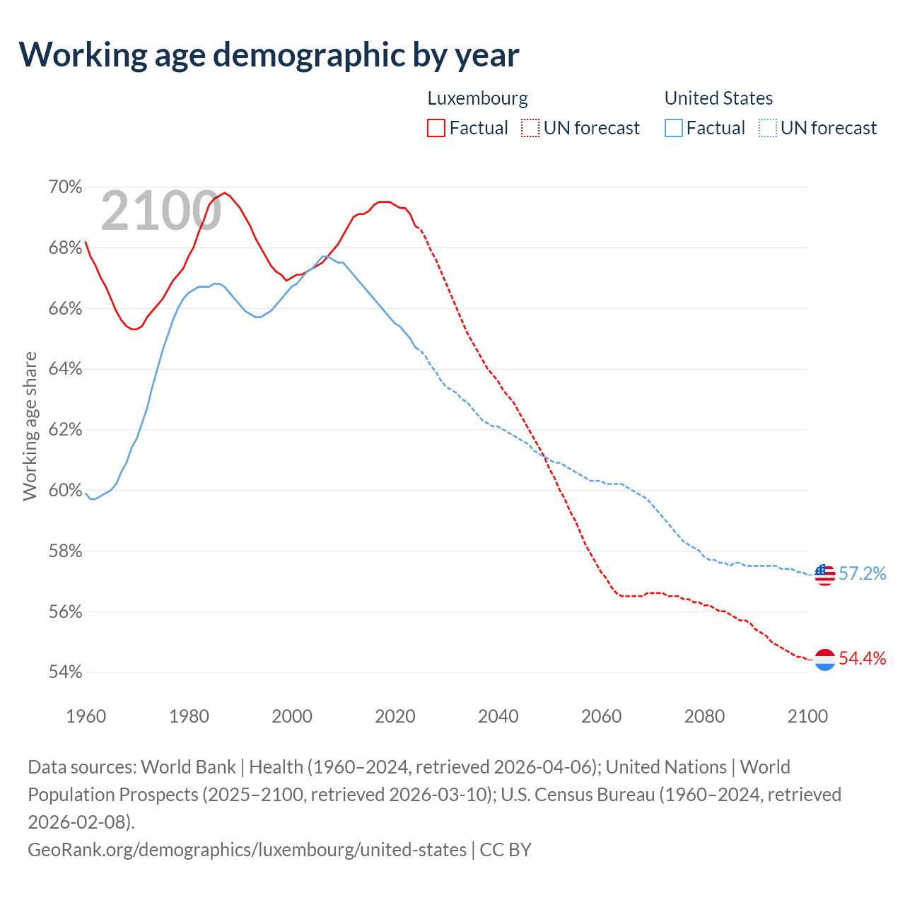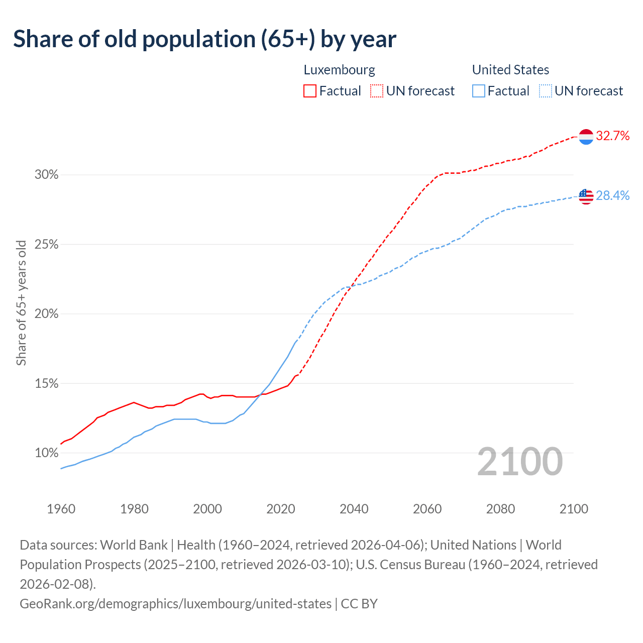 Median age Luxembourg vs United States, 1960-2100
