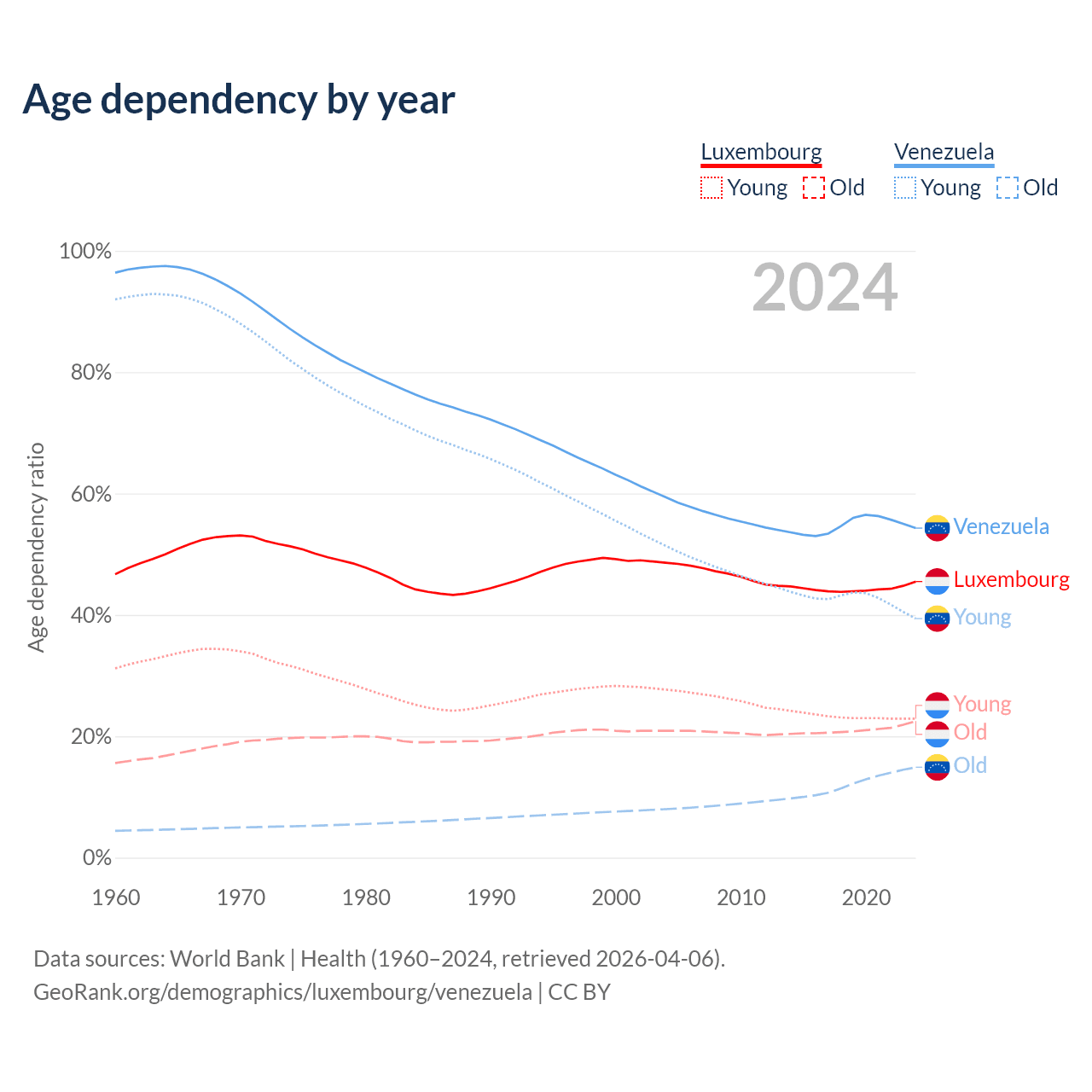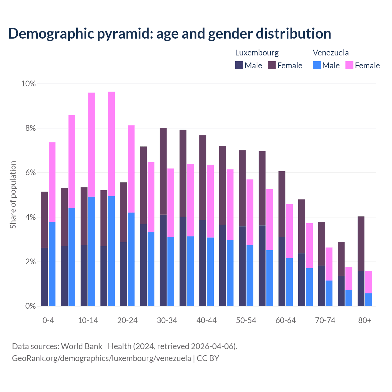 - Luxembourg is ranked 46/196 by median age (oldest to youngest) vs 104/196 for Venezuela.