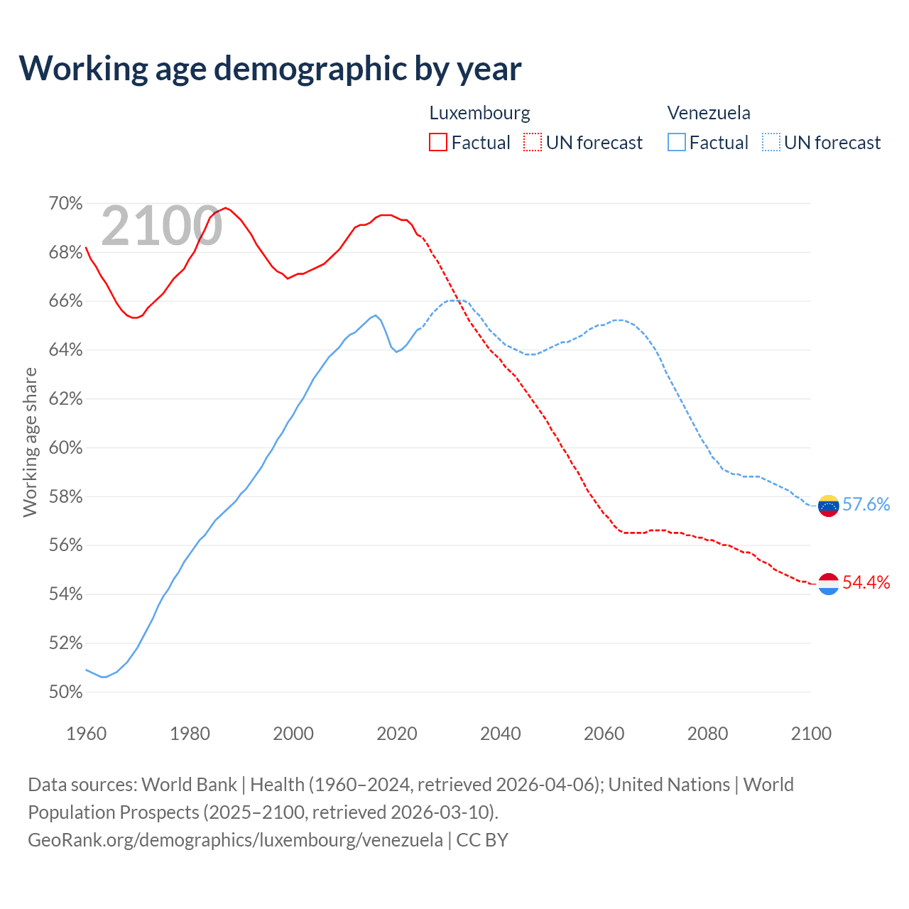 - Luxembourg has 477K working age adults (aged 15-64) vs 18.6M in Venezuela.