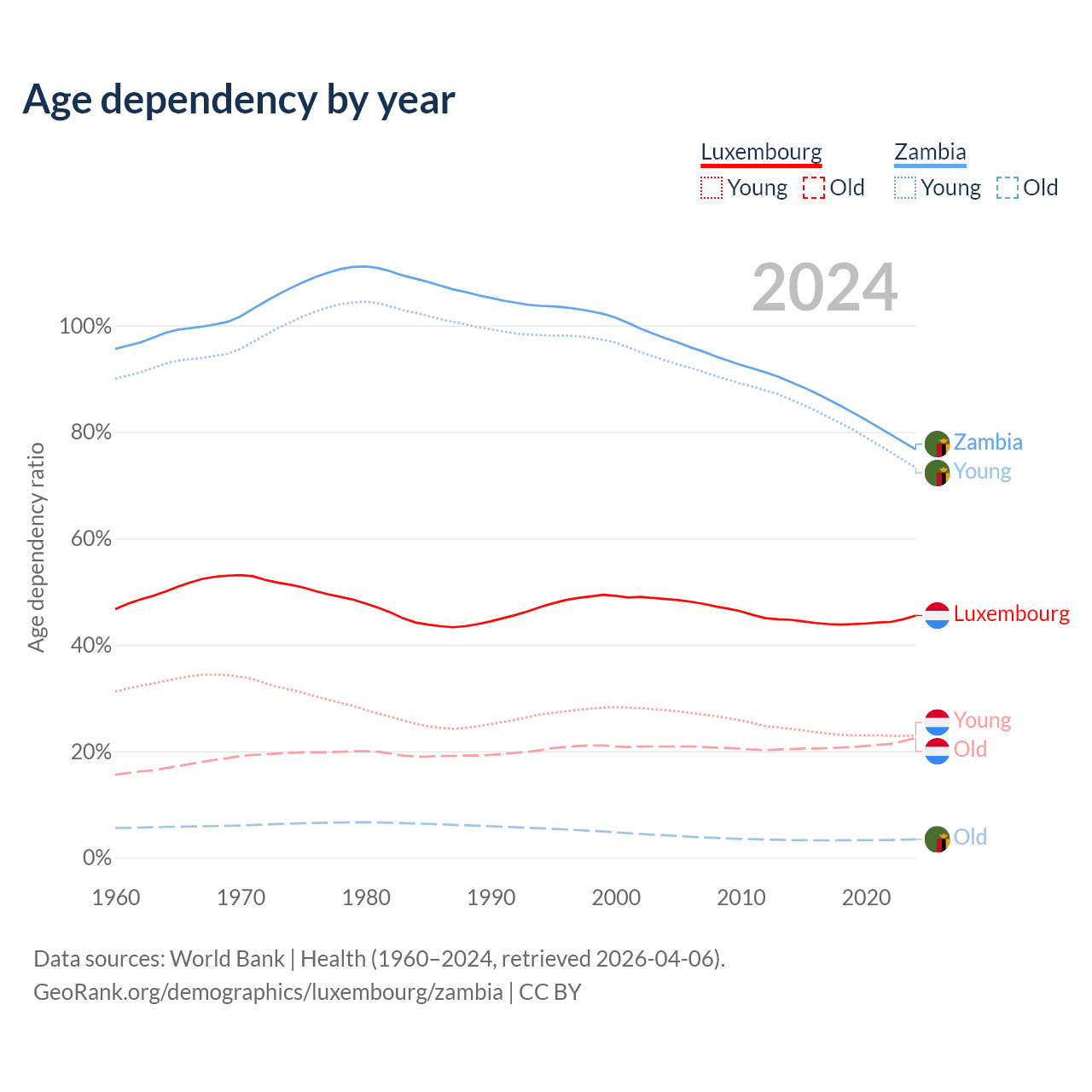 The share of older people aged 65 and over is 15.5% in Luxembourg and 1.95% in Zambia. Life expectancy in Luxembourg compared to Zambia .