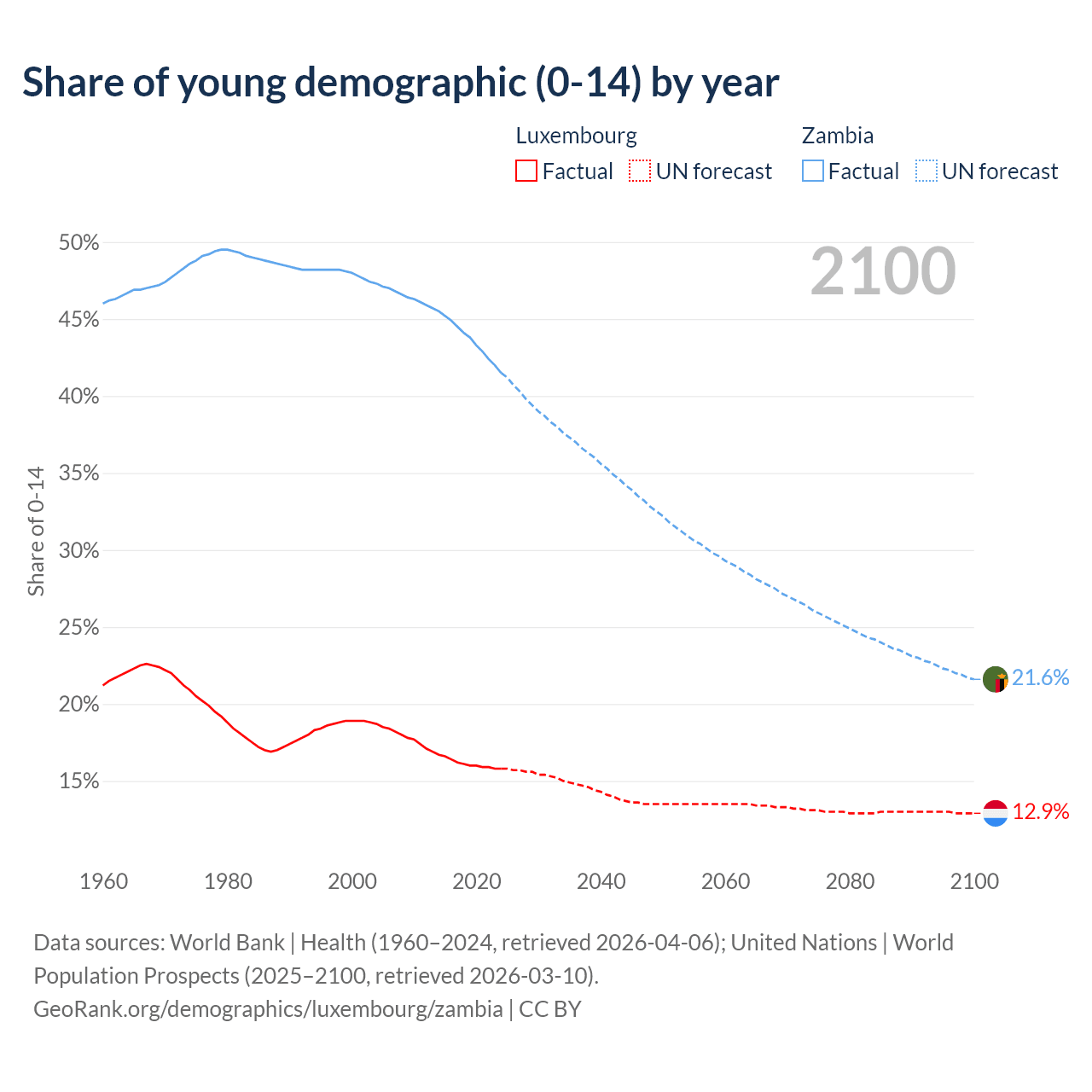 - The share of young demographic (0-15 years old) in Luxembourg is 15.8% vs 41.5% in Zambia.