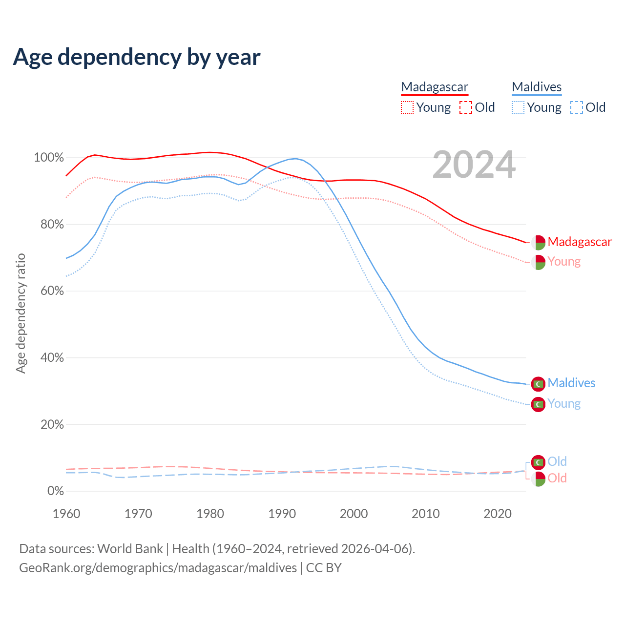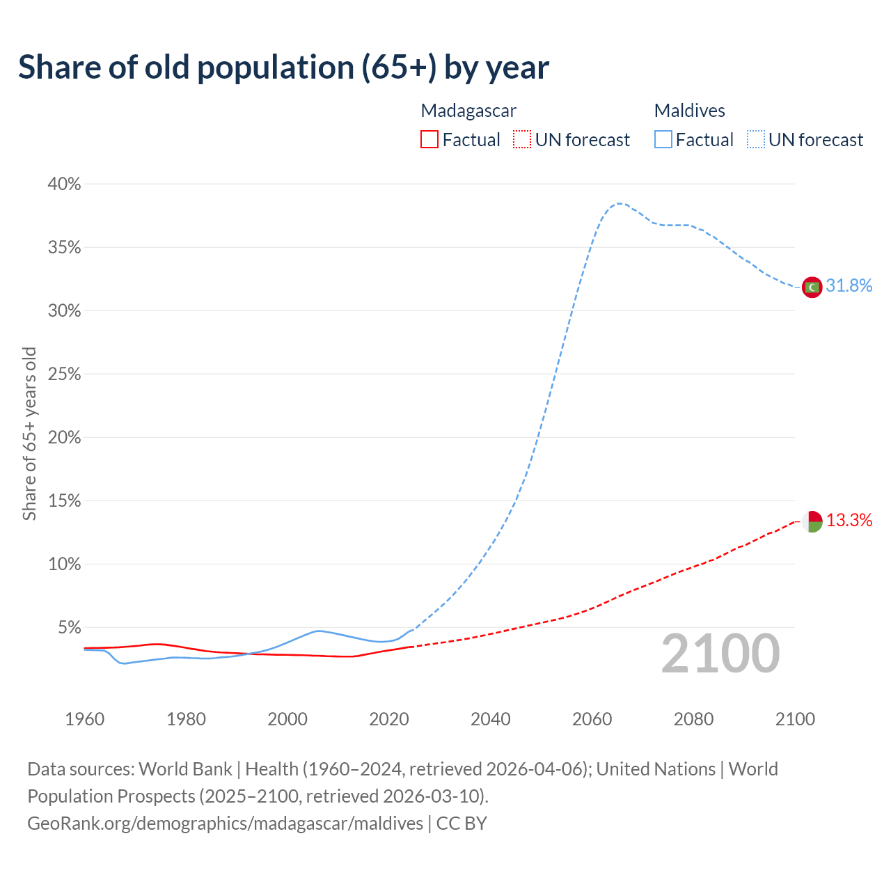 - The share of old-age demographic (65+) in Madagascar is 3.41% vs 4.64% in Maldives.