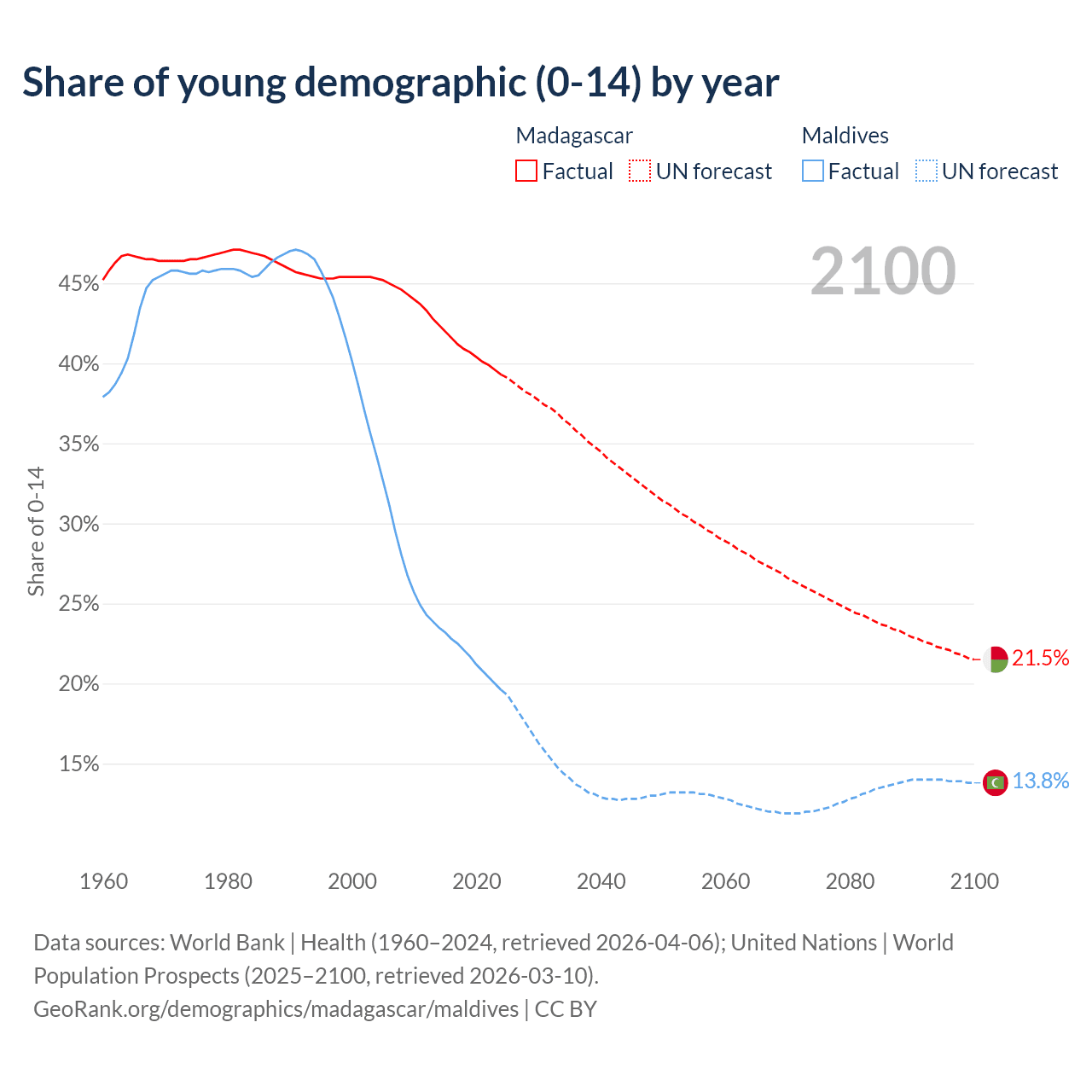 - The share of young demographic (0-15 years old) in Madagascar is 39.3% vs 19.6% in Maldives.