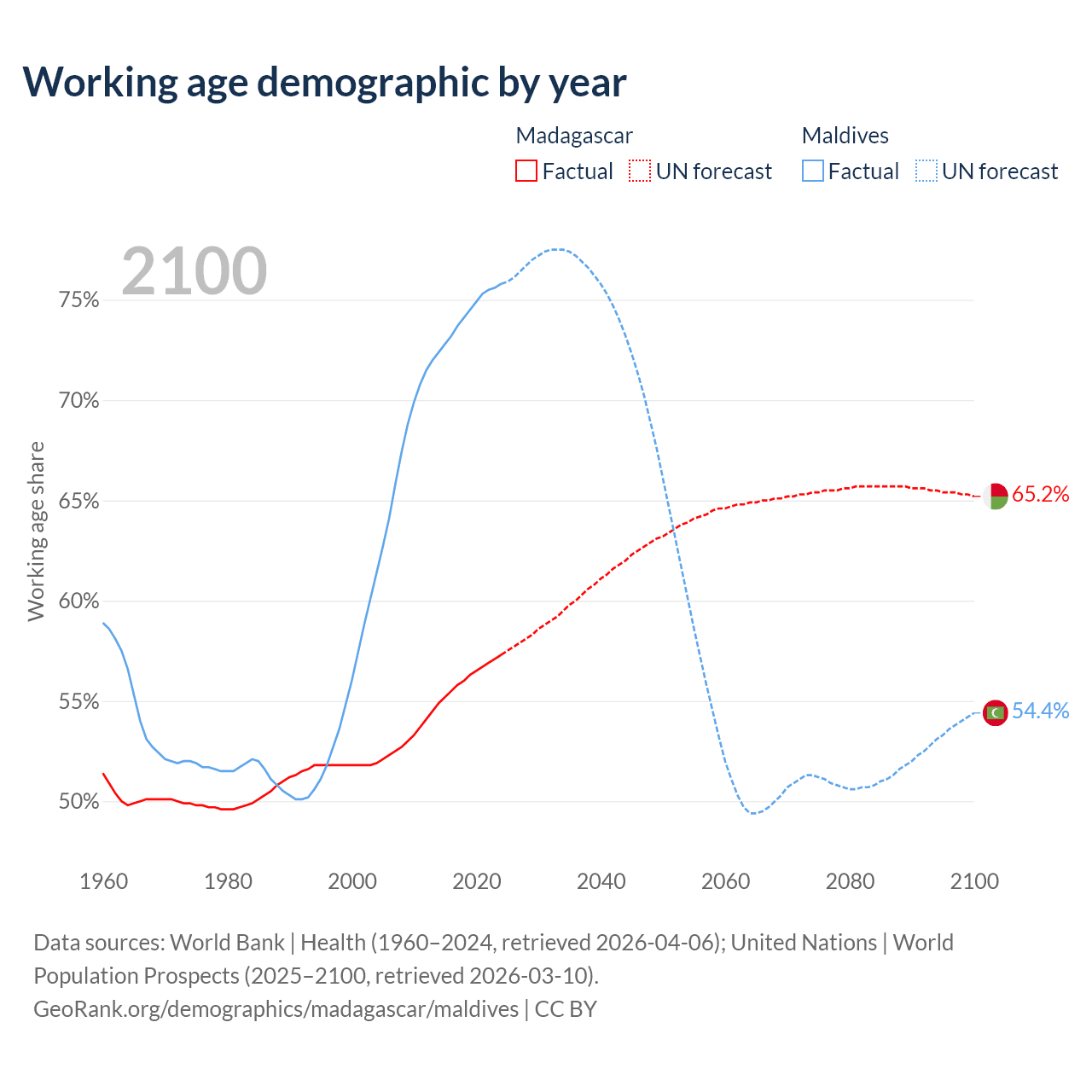 - Madagascar has 19.4M working age adults (aged 15-64) vs 403K in Maldives.