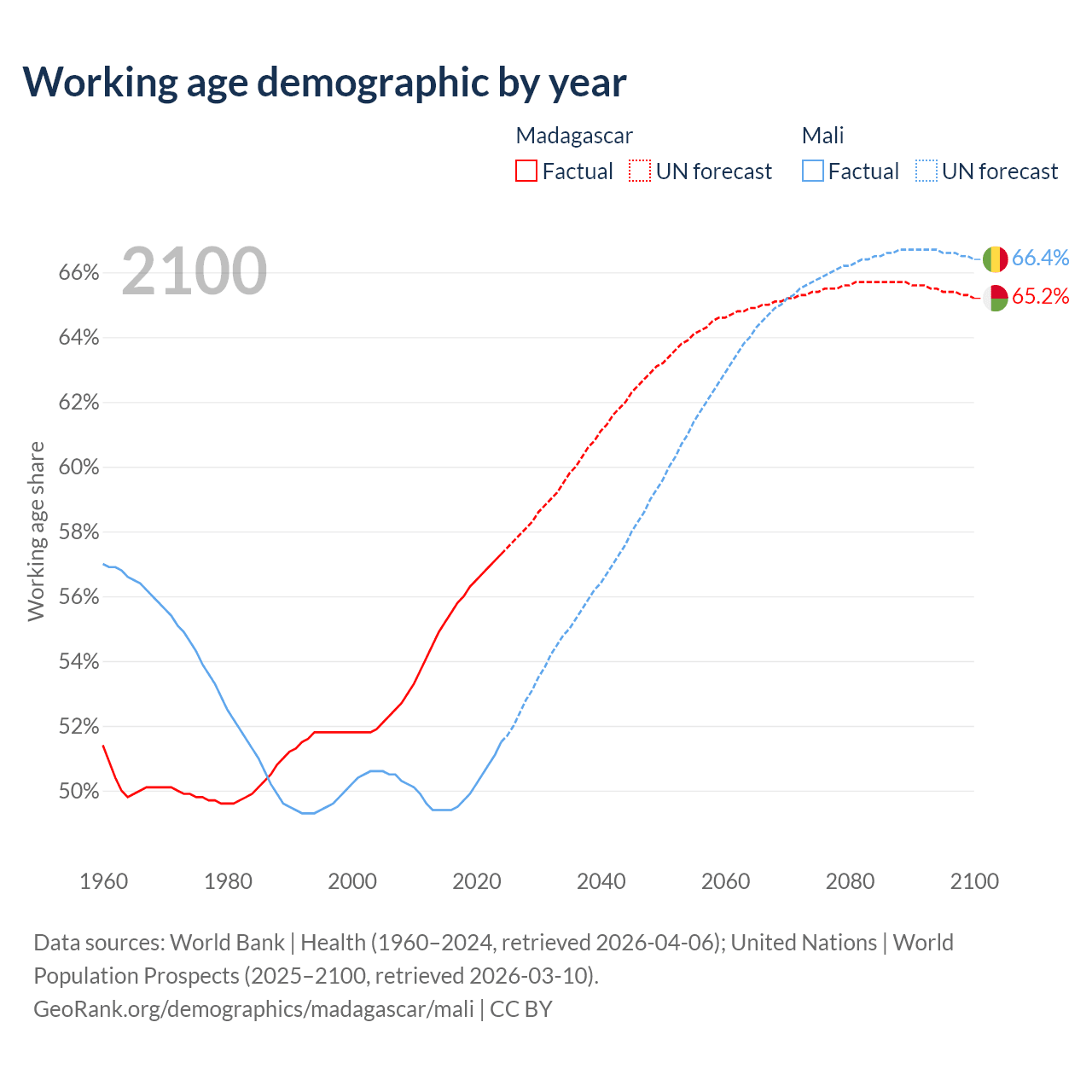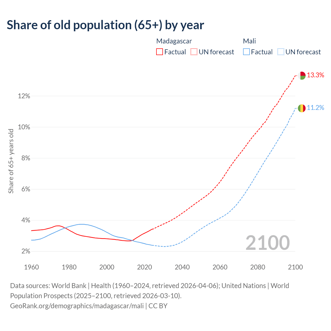 The share of older people aged 65 and over is 3.41% in Madagascar and 2.38% in Mali. Life expectancy in Madagascar compared to Mali .