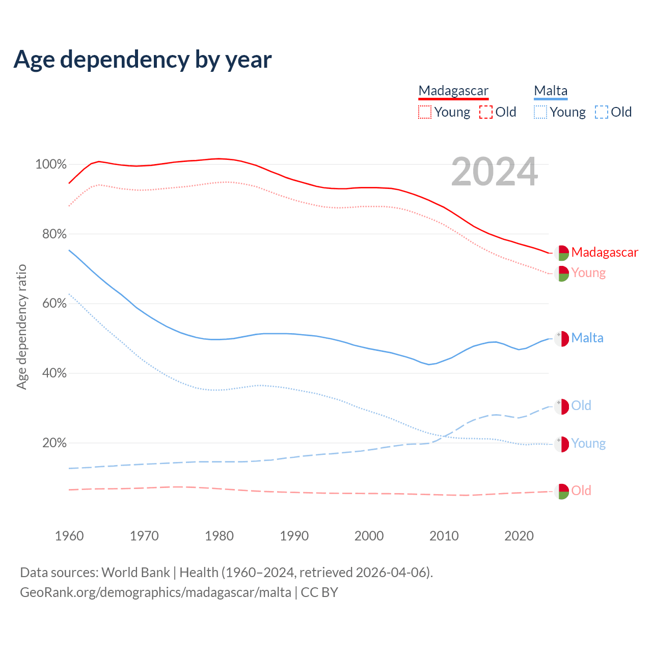 Data sources: World Bank | Health (1960–2024, retrieved 2026-04-06); U.S. Census Bureau (1960–2024, retrieved 2026-02-08).