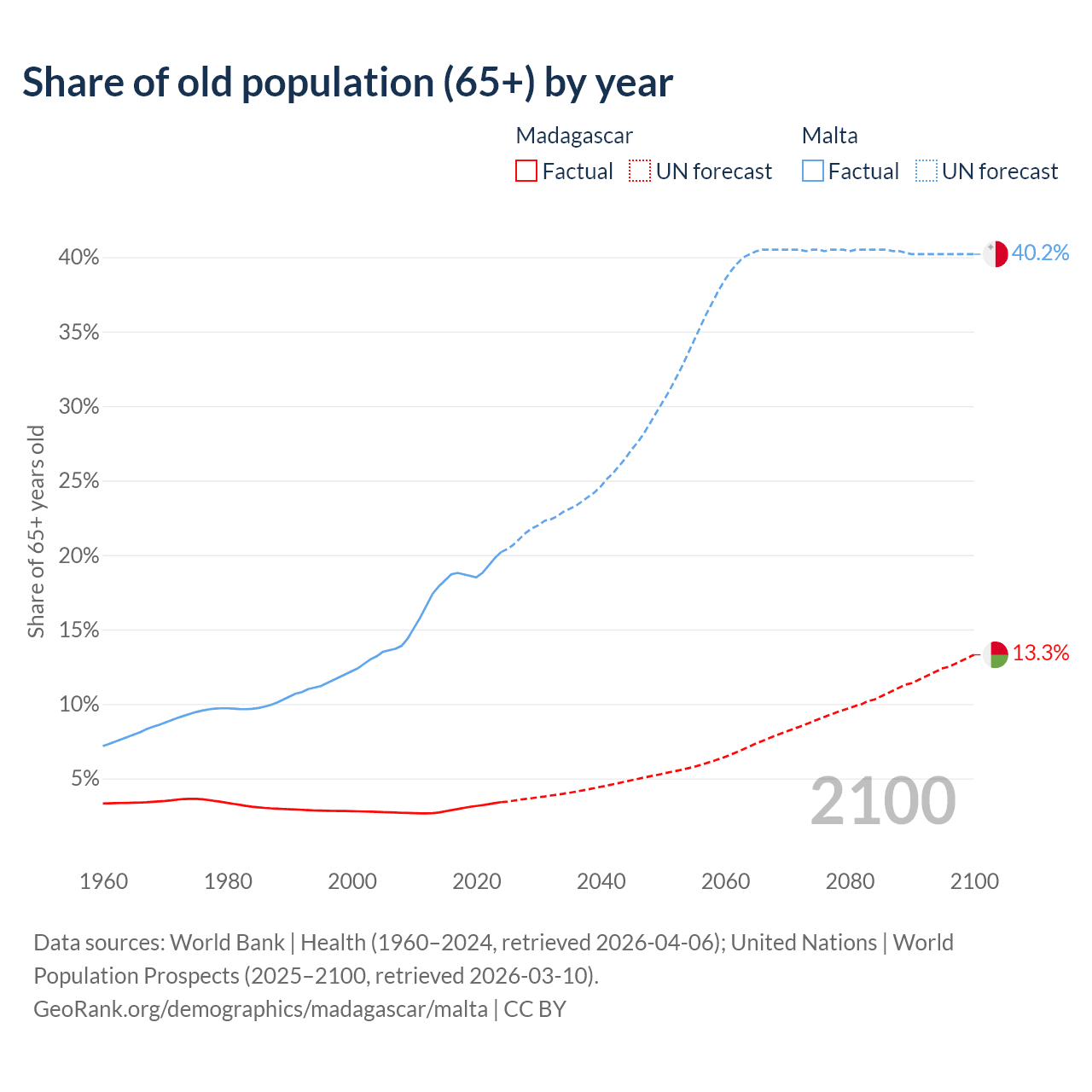 The share of older people aged 65 and over is 3.41% in Madagascar and 20.2% in Malta. Life expectancy in Madagascar compared to Malta .
