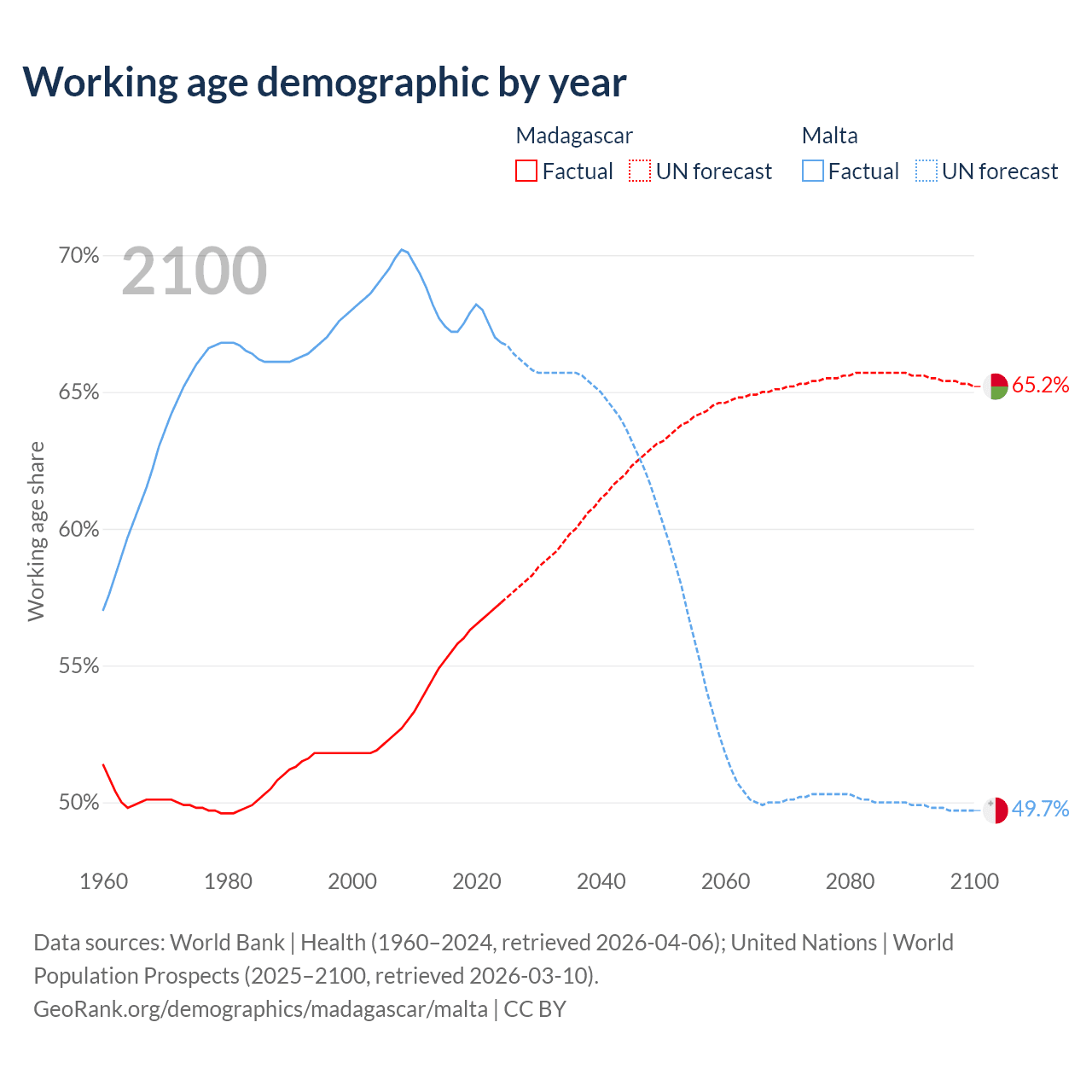 Median age Madagascar vs Malta, 1960-2100
