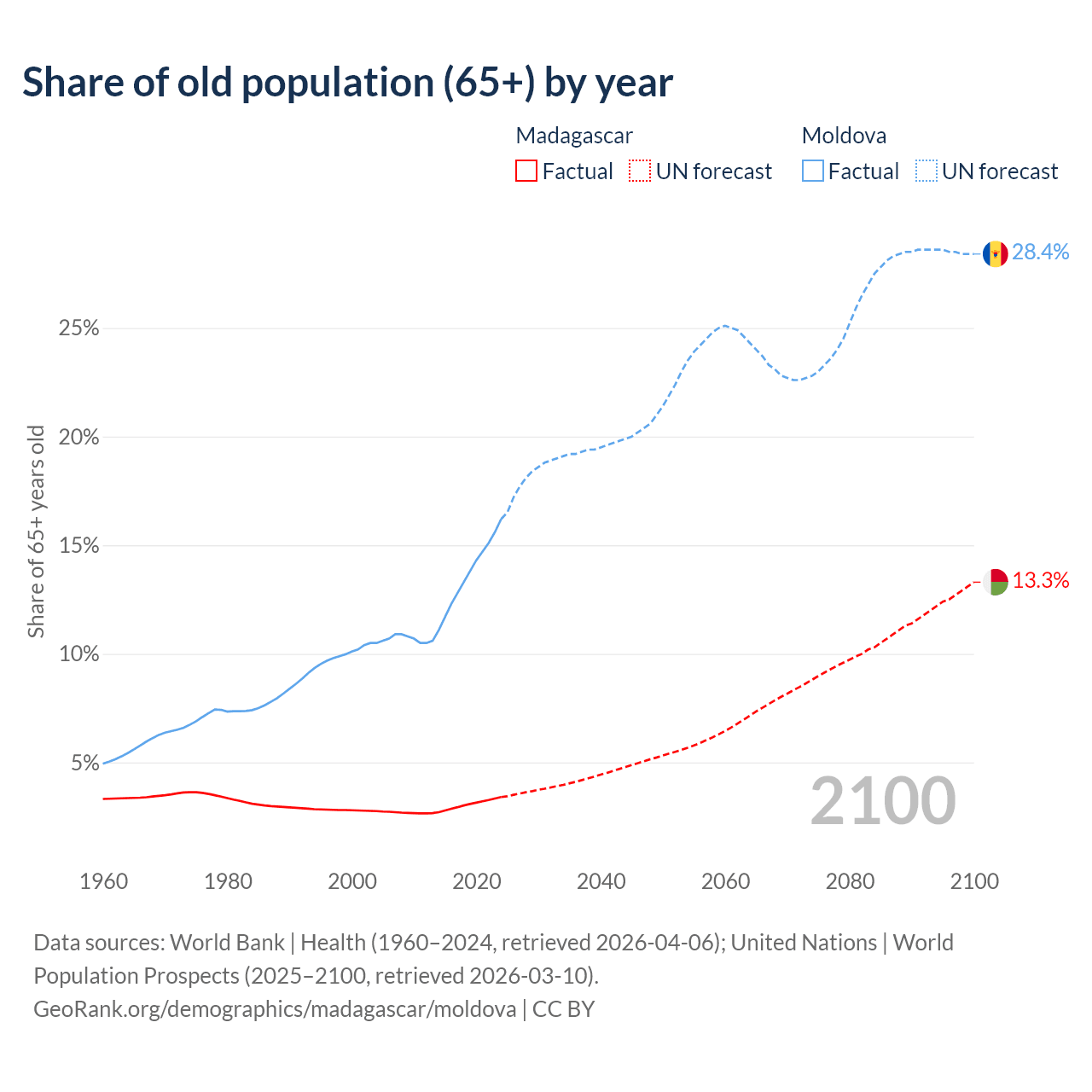 The share of older people aged 65 and over is 3.41% in Madagascar and 16.2% in Moldova. Life expectancy in Madagascar compared to Moldova .