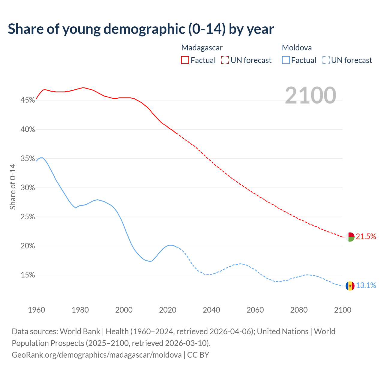 - The share of young demographic (0-15 years old) in Madagascar is 39.3% vs 19.8% in Moldova.