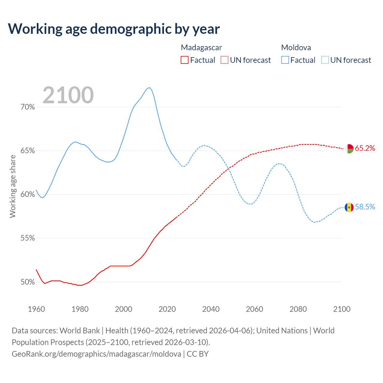 - Madagascar has 19.4M working age adults (aged 15-64) vs 1.5M in Moldova.