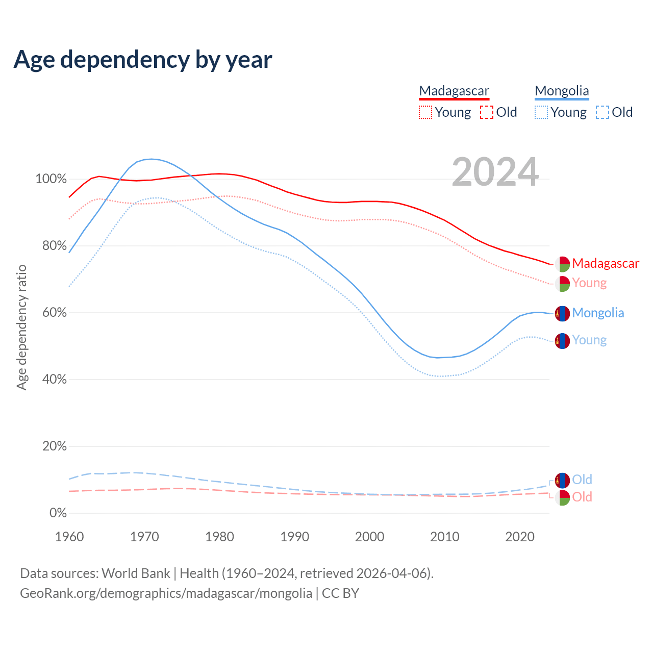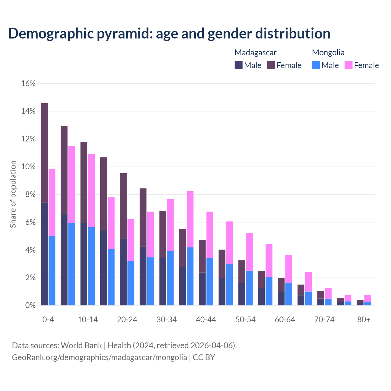 - Madagascar is ranked 165/196 by median age (oldest to youngest) vs 117/196 for Mongolia.