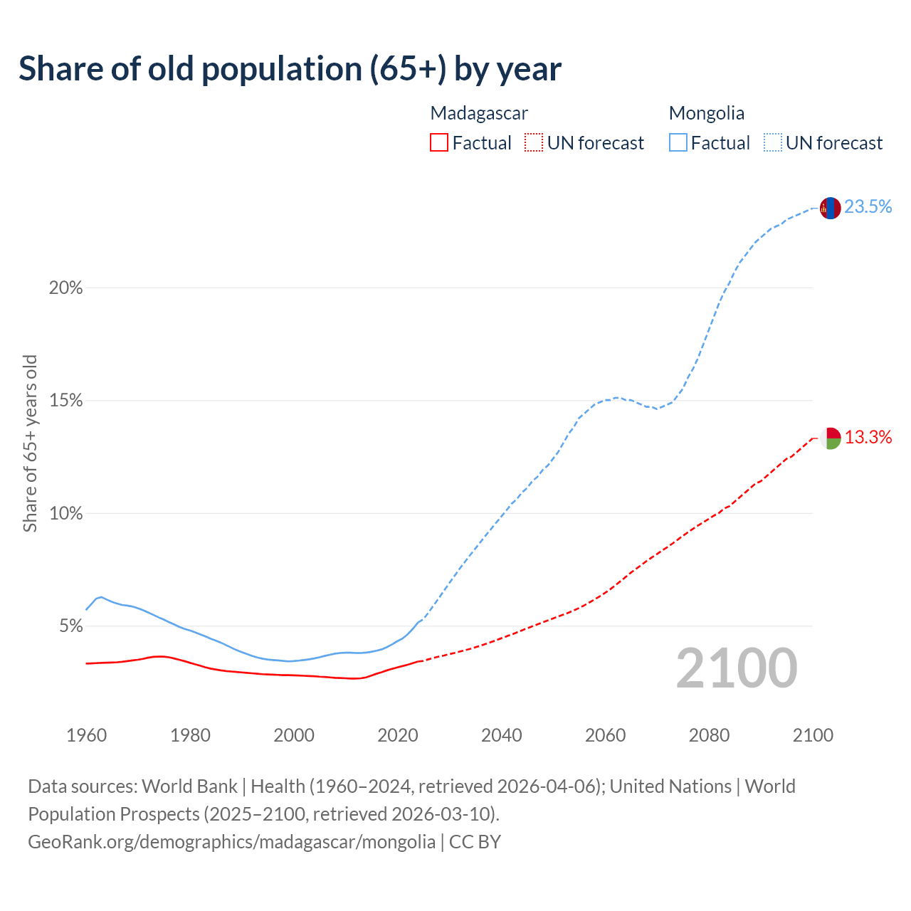 - The share of old-age demographic (65+) in Madagascar is 3.41% vs 5.14% in Mongolia.