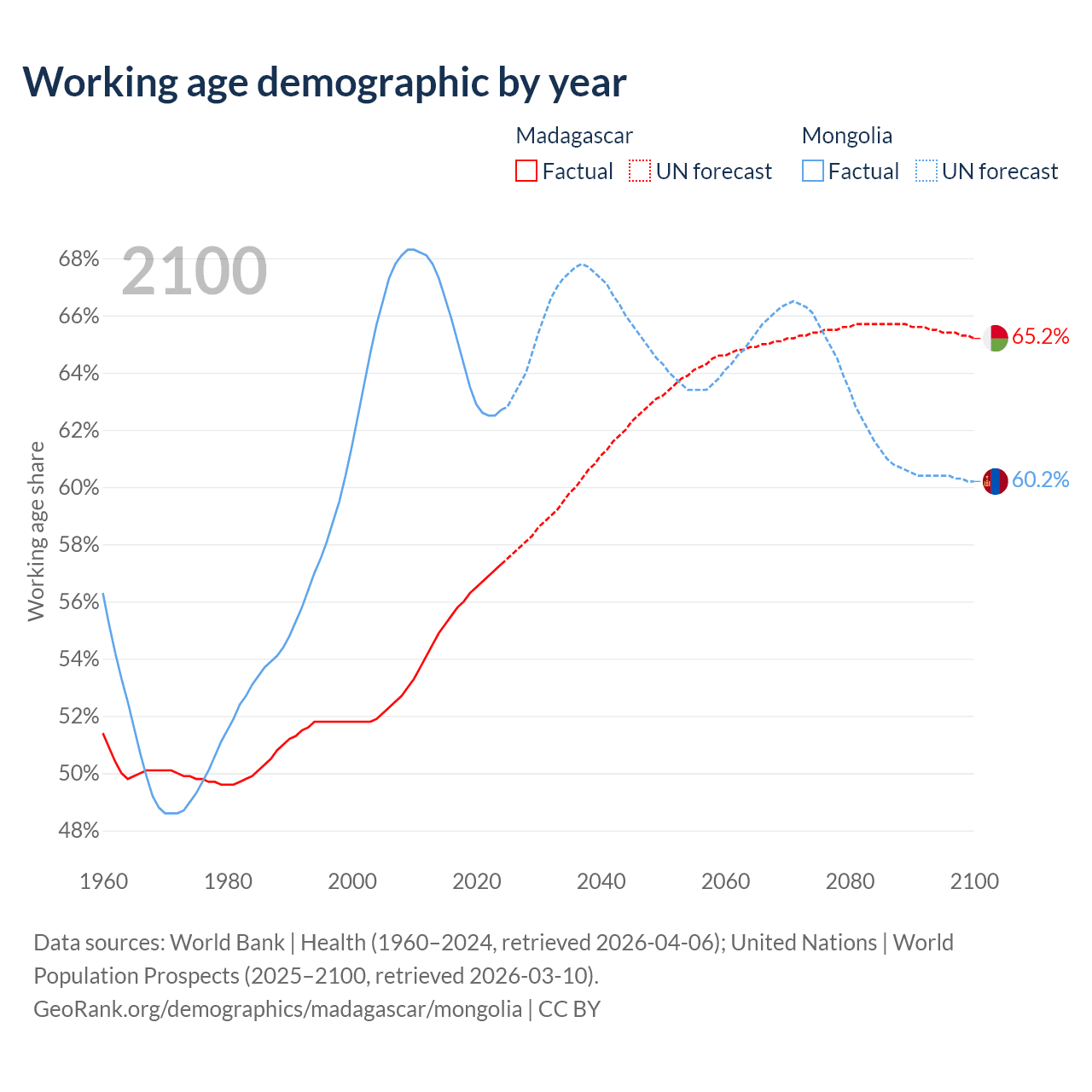 - Madagascar has 19.4M working age adults (aged 15-64) vs 2.27M in Mongolia.