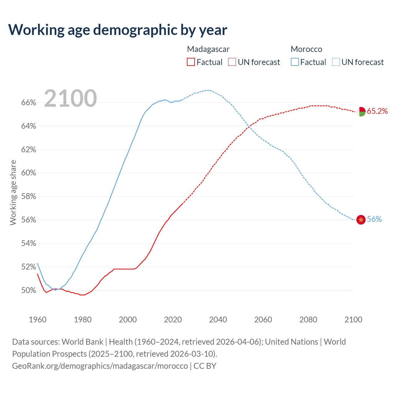 Median age Madagascar vs Morocco, 1960-2100