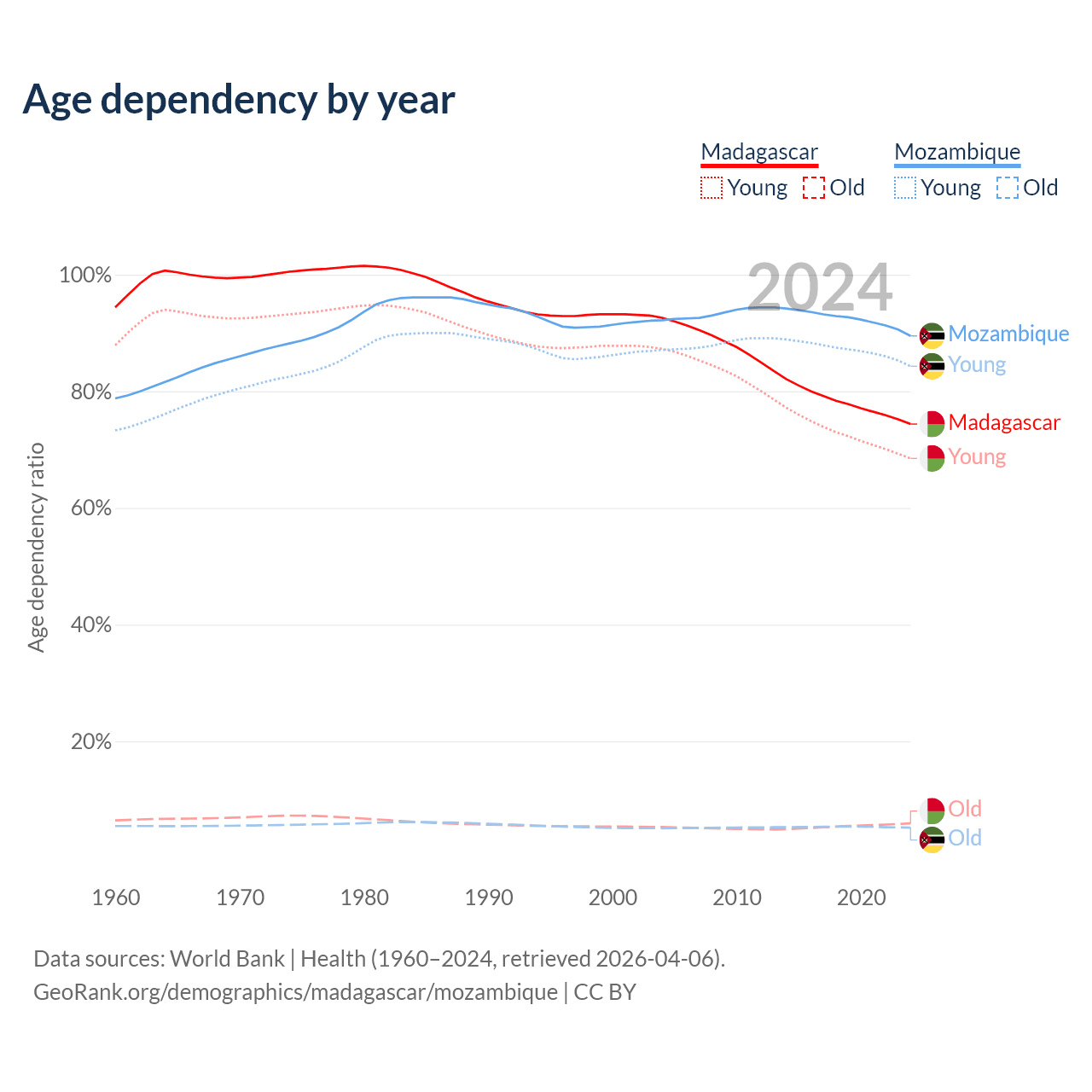 Data sources: World Bank | Health (1960–2024, retrieved 2026-04-06); U.S. Census Bureau (1960–2024, retrieved 2026-02-08).