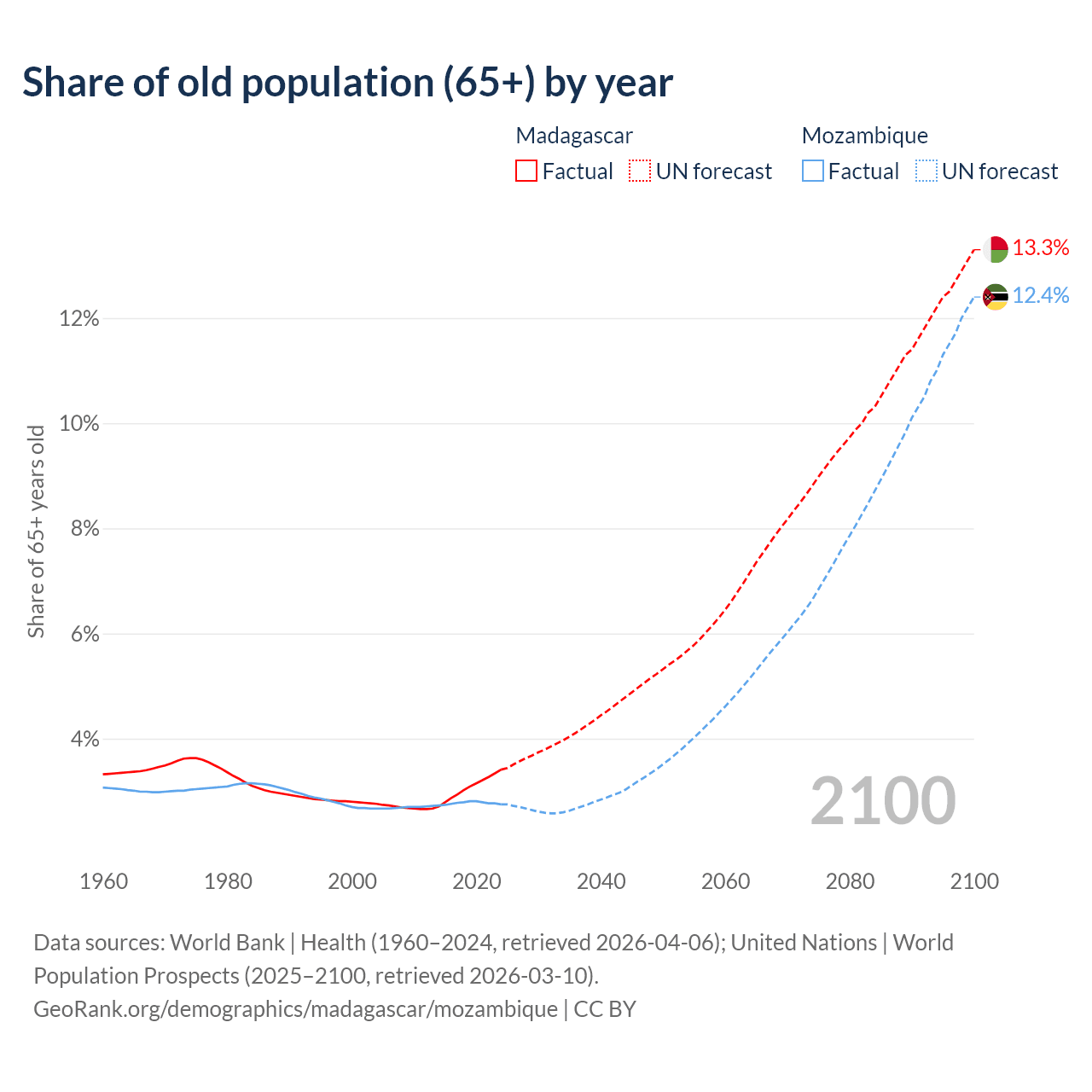 - The share of old-age demographic (65+) in Madagascar is 3.41% vs 2.75% in Mozambique.