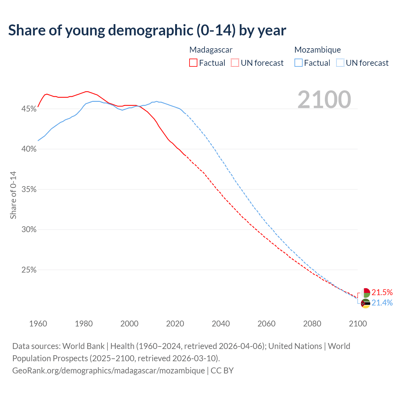 - The share of young demographic (0-15 years old) in Madagascar is 39.3% vs 44.5% in Mozambique.
