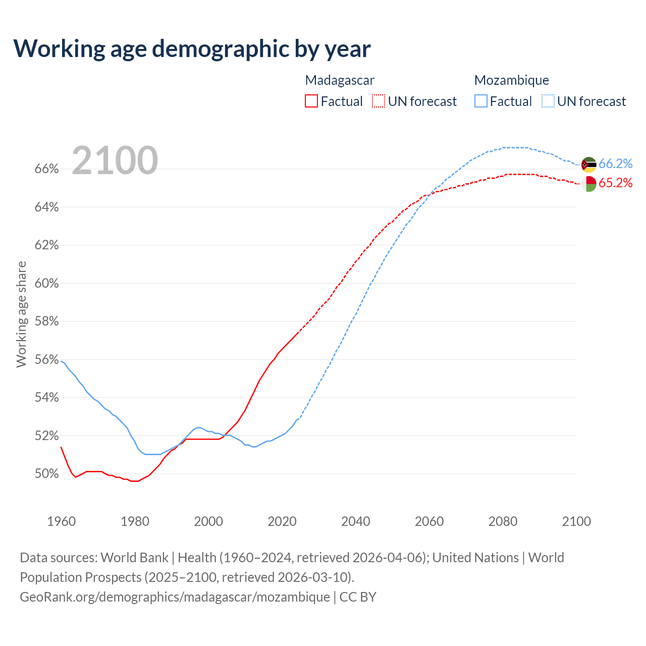 The share of older people aged 65 and over is 3.41% in Madagascar and 2.75% in Mozambique. Life expectancy in Madagascar compared to Mozambique .