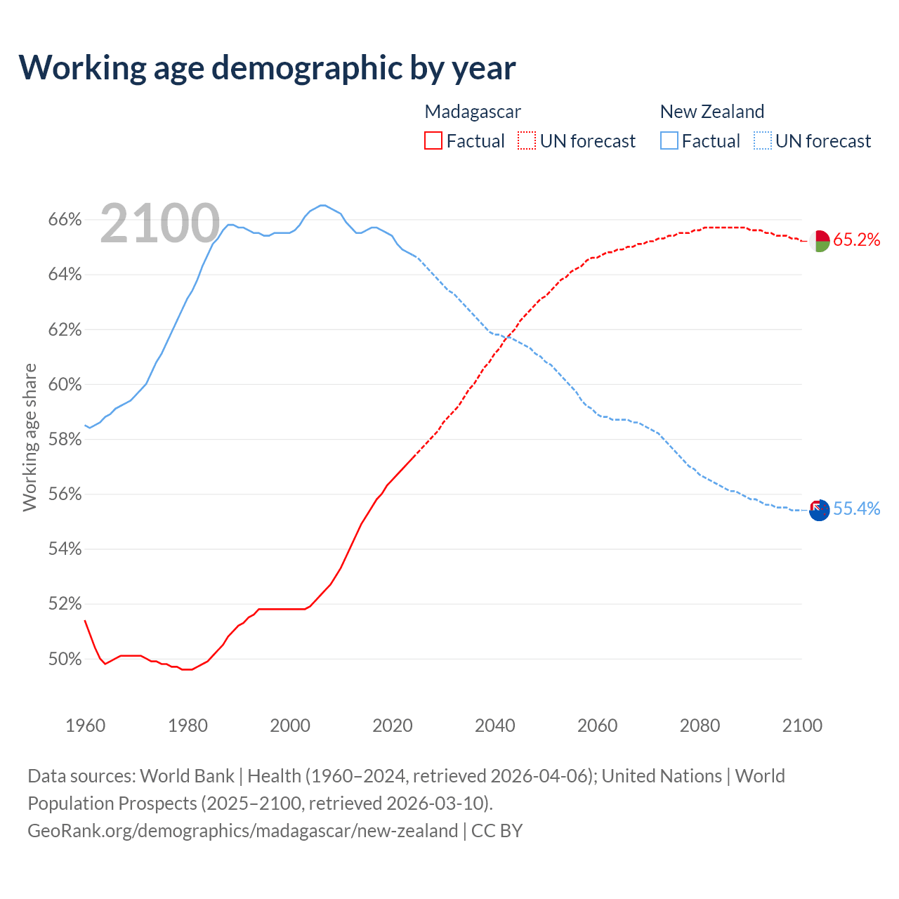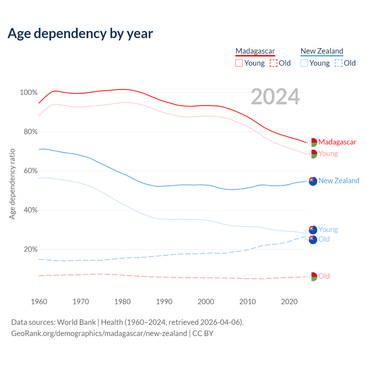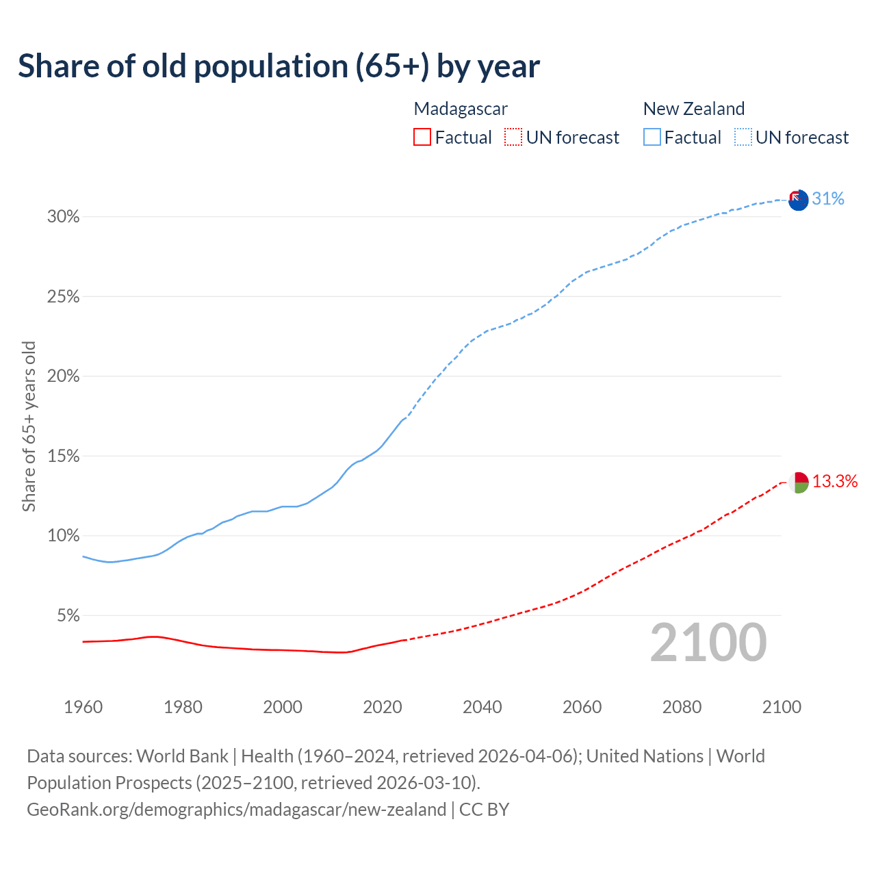 - The share of old-age demographic (65+) in Madagascar is 3.41% vs 17.2% in New Zealand.